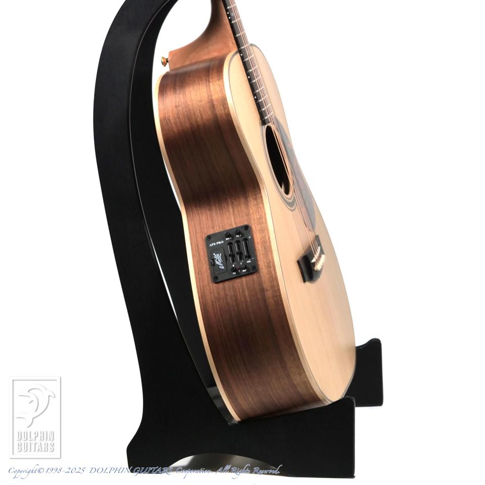 搭載されたAP5pro・ピックアップ・システムは、オリジナルのアンダーサドル・PUにコンデンサーマイクを併用する事により、奥行きのある音域と抜群なエアー感に加え、ボディー・ヒット音も余すことなくアウトプットします。また、高い出力を持つプリアンプを内蔵しておりますので、外部プリアンプ等を使用せずとも、そのままプラグインしていただければ極上のサウンドをお楽しみいただけます。PUとマイクVolは完全に独立しており、手元での出力バランス調整が可能ですのでお好みや現場に合わせてご使用下さい。