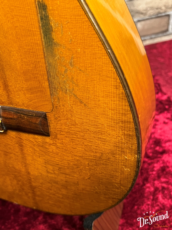 表面板を中心に全体的に演奏キズ等によるダメージが大きく、百戦錬磨のごとく弾き込まれてきたことが窺われます。表面板のセンター下部には割れ修理歴がございます。