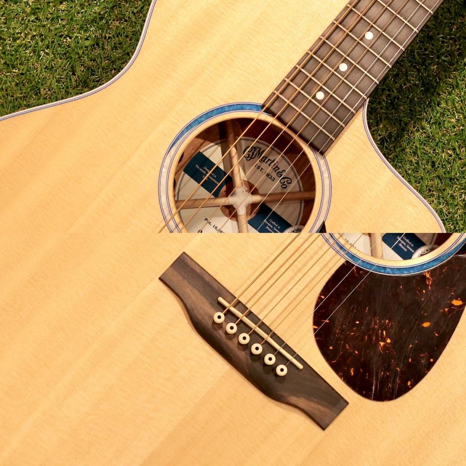 外観にもマーティンらしさが光ります。トップのスプルースとコアの組み合わせが織りなすナチュラルな木目に、グロス仕上げのボディとサテン仕上げのネックが調和。指板とブリッジにはエボニーを採用し、高級感と耐久性を兼ね備えています。ロゼッタにはブルー系のマルチストライプを配し、12フレットには「Celestial Bullseye(天体の的)」をモチーフにしたインレイを配置。モダンなセンスを感じさせるスタイリングが、ステージでも確かな存在感を放ちます。