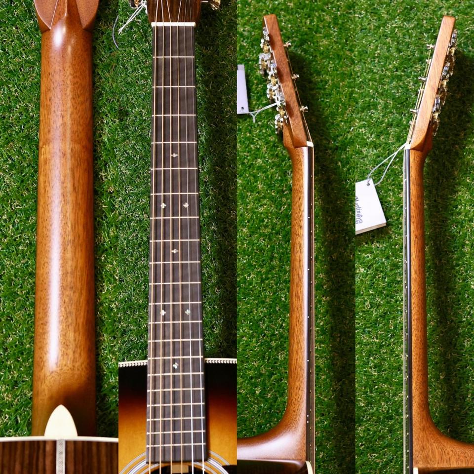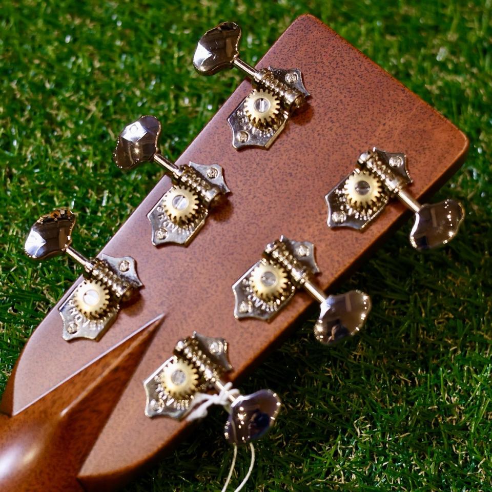 デザイン面では、ヘリンボーンパーフリングのほか、ジグザグパターンのバックストリップ、ダイヤモンド&スクエアの指板インレイ、エイジングトナー仕上げなど、伝統的な雰囲気を再現する細部へのこだわりが見られます。ペグにはニッケルオープンギアチューナーを採用し、クラシックなルックスと安定したチューニング精度を両立しています。