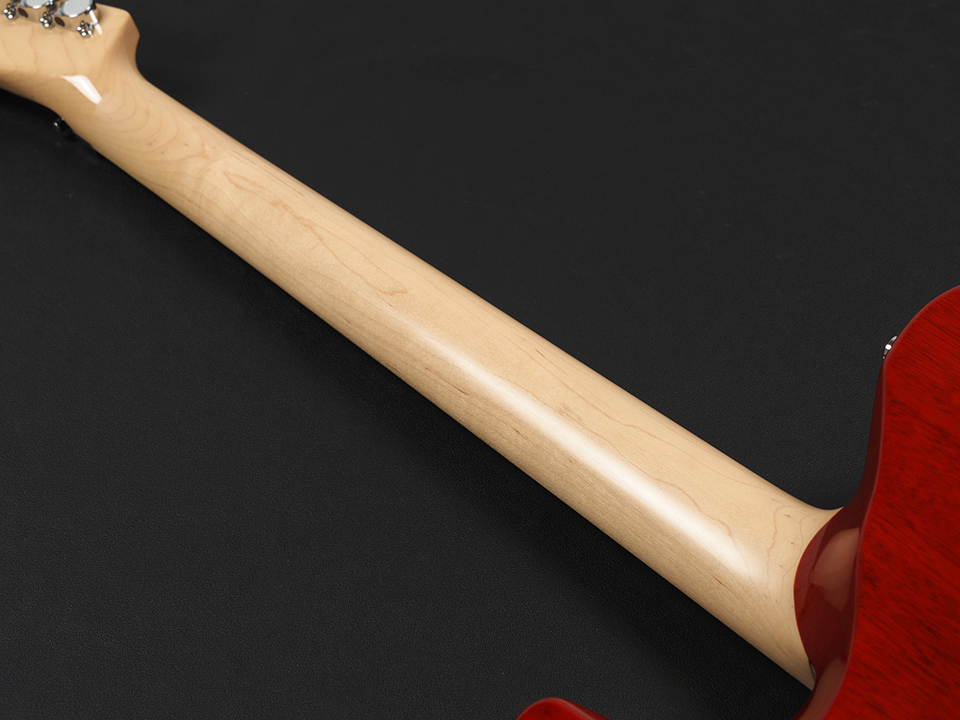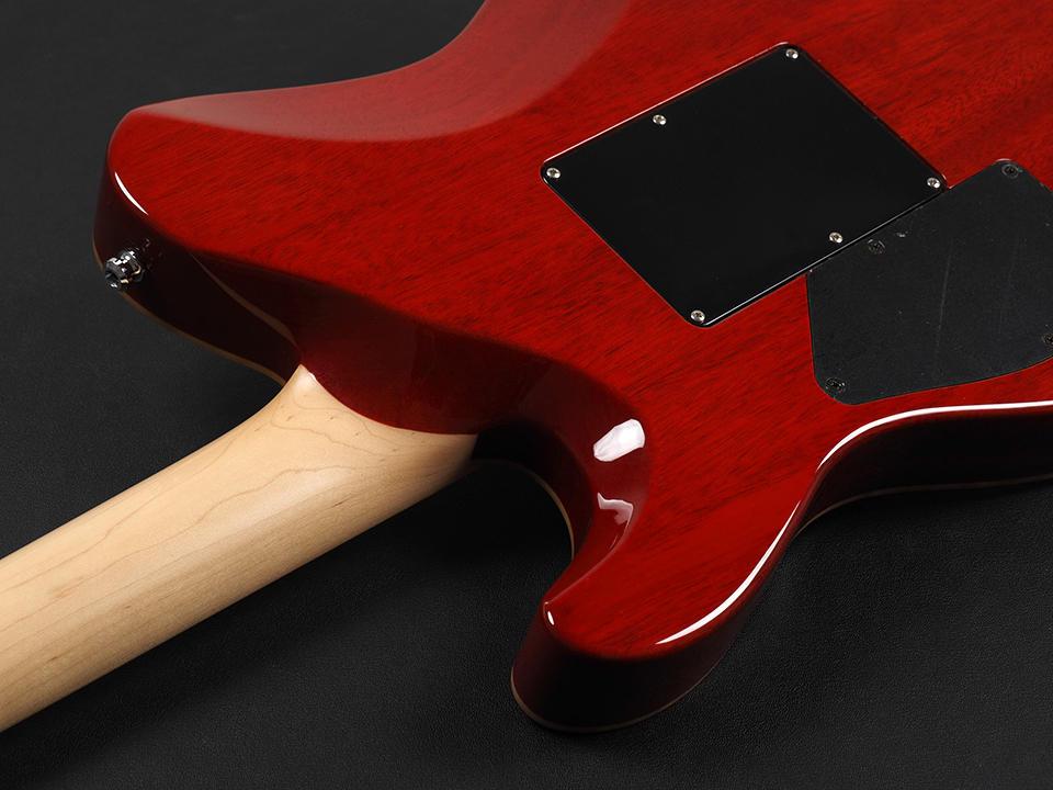 美麗なキルトメイプルトップにホンジュラスマホガニーバックのボディ、メイプルセットネック、24Fのメイプル指板にて構成されます。