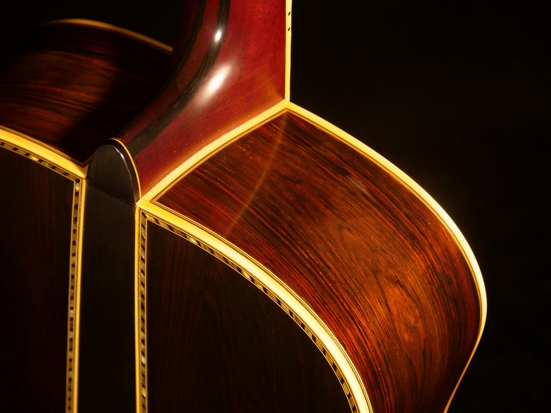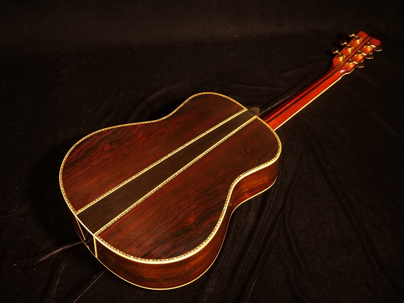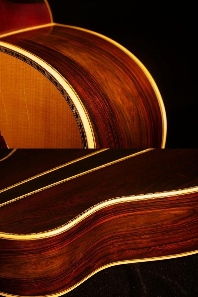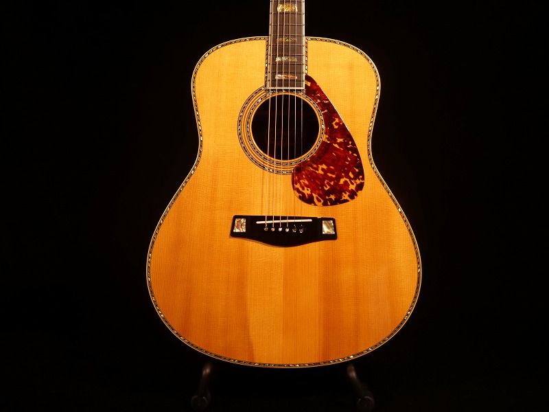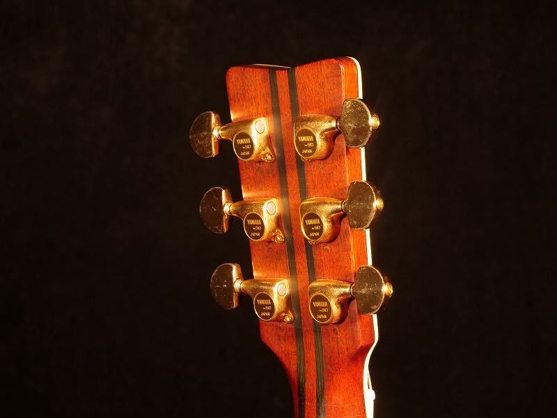 ボディシェイプはヤマハオリジナルのジャンボタイプ、高級エゾ松/トップ、高級ハカランダ/サイド&バック(3ピース)のALL単板、マホガニー+エボニーの5P・ネック、エボニー指板&駒、ボディトップ・バック&ロゼッタにはバイアスインレイ、ヘッドトップ・ポジションマークには本アバロン貝(メキシコアワビ貝)、ペグはTM67Gに交換、ピックガードは当時オプションだった本鼈甲仕様といった最上級モデルにふさわしい豪華仕様です。