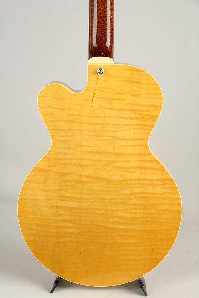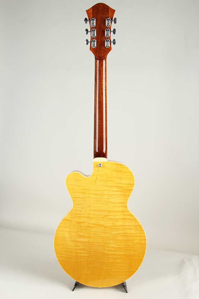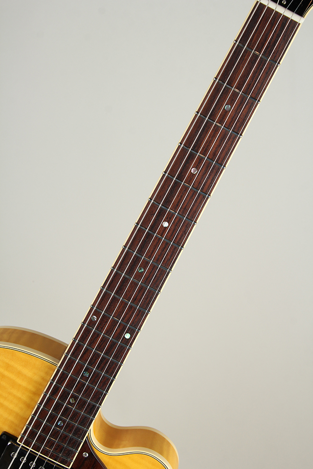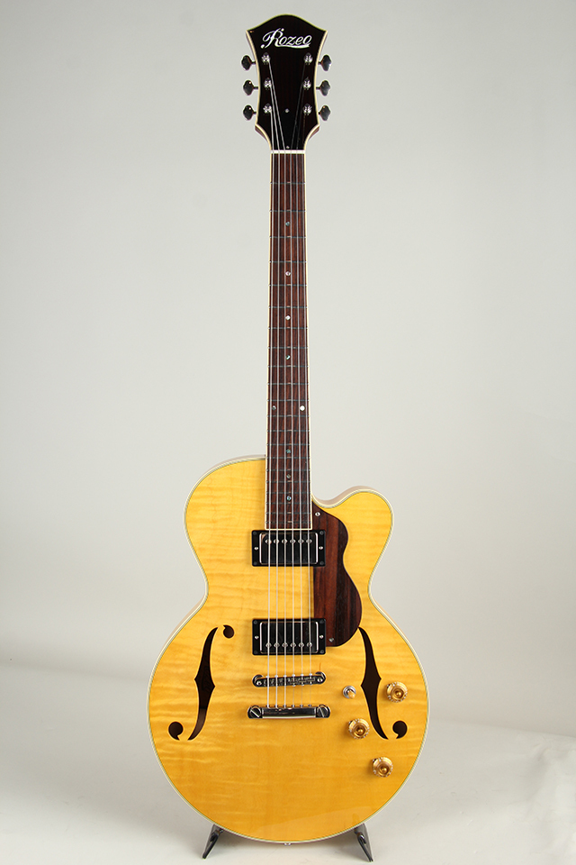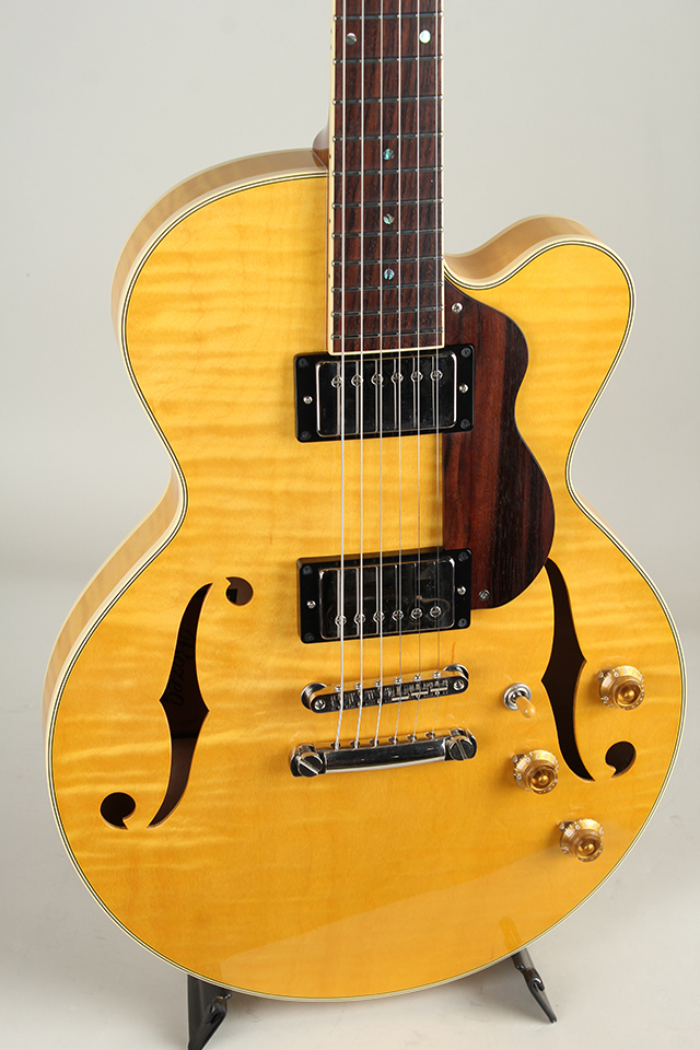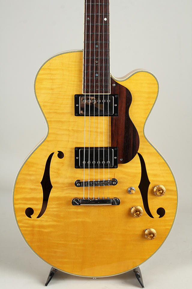 当モデルはカーリーメイプル材をボディに使用したセンターブロック構造のセミアコースティックモデルです。マホガニーネックにローズ指板といったセミアコモデルとして王道のウッドマテリアルが採用。