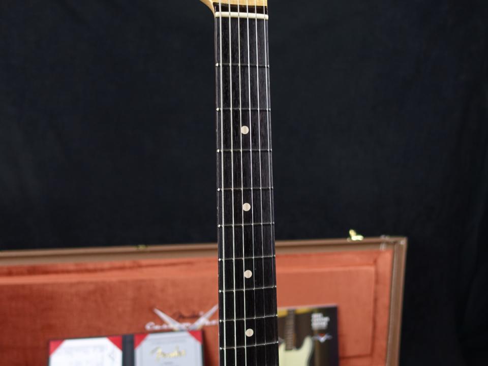 またポジションマークにはMicarta Whitaが打たれ、間隔が広い12Fのポジションマークとなっており、王道の63仕様ではなく全体の雰囲気やピックガードとの統一感などマスタービルダー作品らしい細かい箇所のこだわりが見えます。
