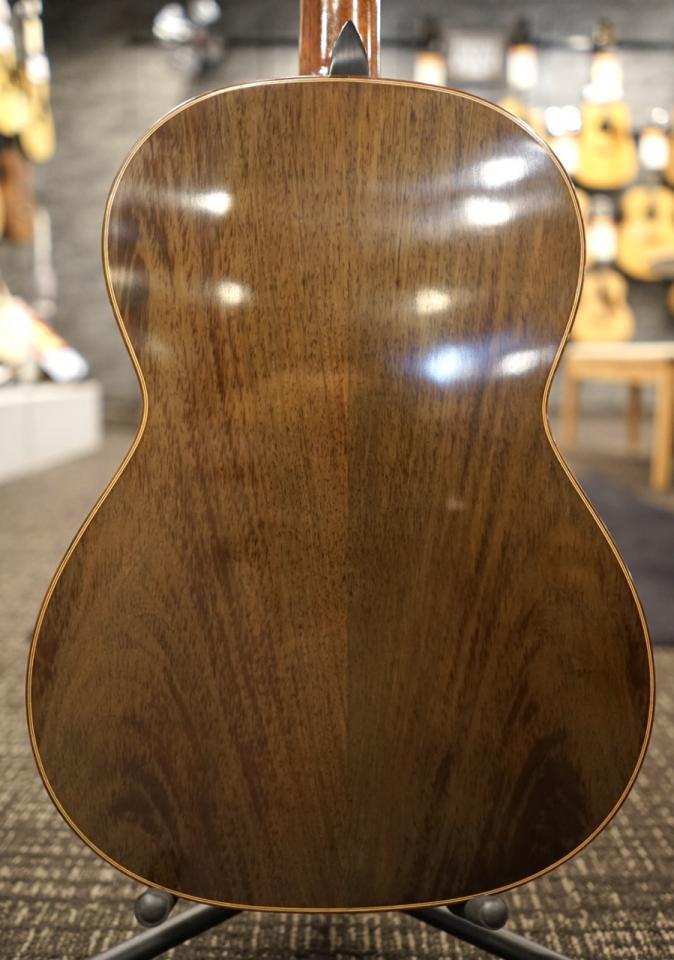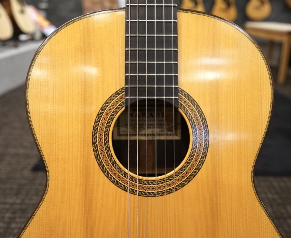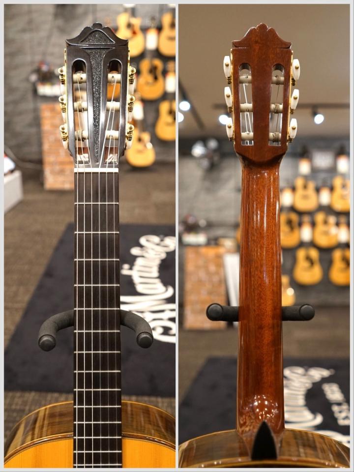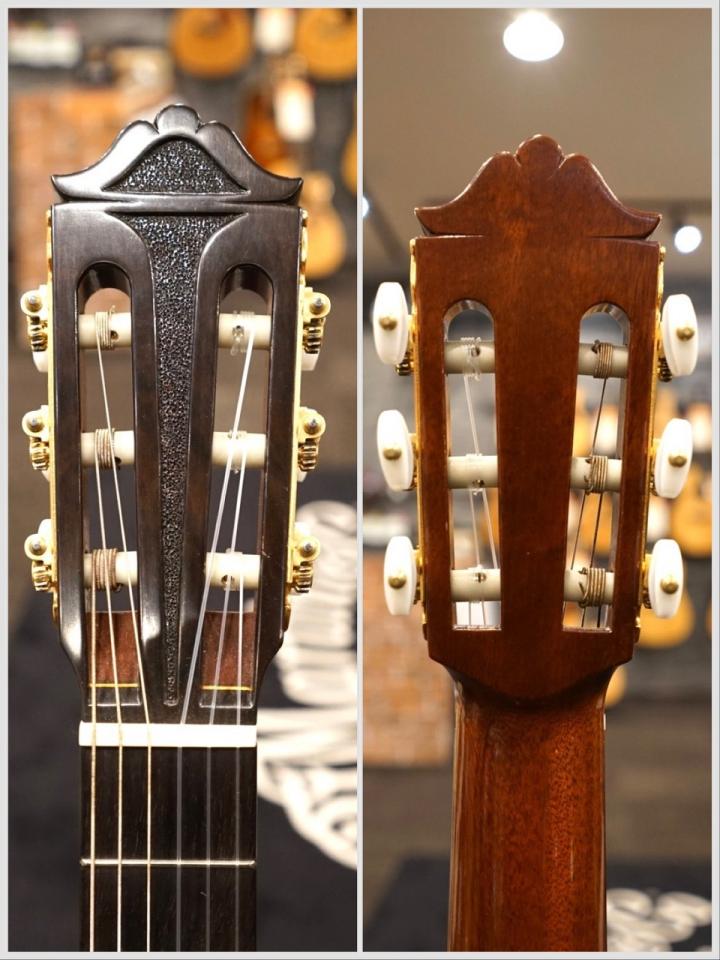 本器は中出敏彦氏が1996年に製作した1本で、表板に松単板、サイドとバックに中南米ローズウッドを用いています。弦高は12フレット上の6弦側で4.0㎜、1弦側で3.0㎜。
