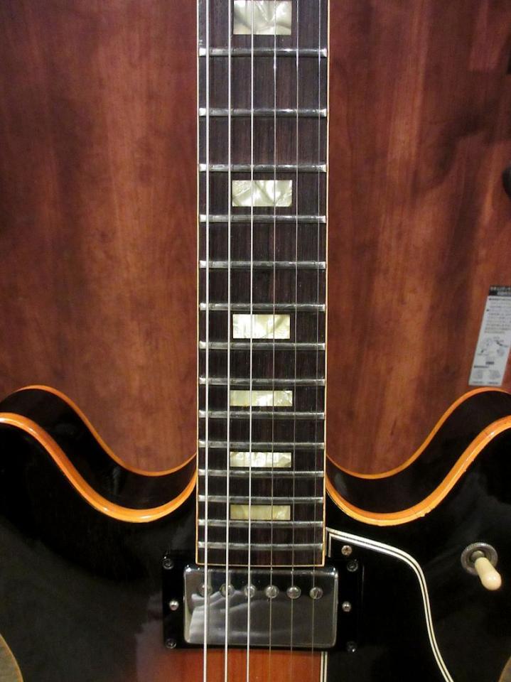 1958年に発表されて以来、その革新的な構造とサウンドにより現在まで途切れることなく生産が続けられている名機ES-335。生産された年代により様々な仕様が存在し、それぞれにキラリと光る魅力が感じられるのは、基本的な構造や設計が優秀なればこそでしょう。本機は1978年製の個体、ボディー材にはこの時期には珍しくゴージャスなフレイムメイプルが使用されており、ややスリムに仕上げられたメイプル3Pネックも高い剛性感を感じさせる良質なマテリアル。ピックアップはスーパーハムバッカーを搭載しており、多彩なサウンドメイキング可能とするタップスイッチも装備しております。3kg後半あたりの個体が多くみられるこの時期の個体としては驚くほど軽量で、そのウェイトとバランスの良さもあってか乾きまくりのヌケまくり、硬質なサウンドをイメージされる方も多いかと思いますが、なんのなんの!艶やかでしっかり太さのあるトーンが楽しめます!ナットとチューナーが交換され、ストップテイルピース仕様にコンバートされている以外は変更点も見当たらず、全体的にクリーンな状態をキープ。現行カスタムショップ製335の中古並みのプライスでこのサウンドは・・・ナウでヤングなギタリストにも是非オススメしたい良個体です♪ウェイト3.45kg、汎用ハードケース付属。