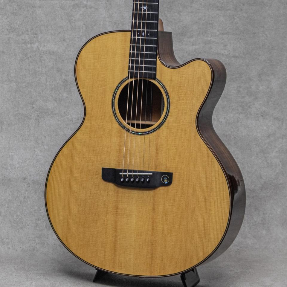 ブックマークする 値下げ通知に登録北九州久留米市にて製造される"Asturias(アストリアス)"は、1962年からのクラシックギター製造に端を発する純国産の老舗ブランド。“偉大なギターといえども、弾きやすくなくてはならない”をモットーに少数の職人によって製造され、安定した品質とプレイヤビリティが魅力。1990年代からラインナップを広げている鉄弦モデルもスタンダードモデルから高級機種まで高いクオリティで楽しめる完成度が人気です。本器は特にフィンガー系プレイヤーに向けてオリジナルデザインがされた16インチボディモデル"Grand Solo SR”。2014年製USED品。ジャーマンスプルーストップ、インディアンローズウッドサイド&バック、マホガニーネック、エボニー指板&ブリッジ、ゴトー510ペグ、アバロンロゼッタ、ウッドバインディング、ベネチアンカッタウェイ、スキャロップドXブレイシング。加えて本器には、新潟・十日町の"Ogawa Inlay Craft"にて施されたハンドカットのカスタムインレイが追加されています。くびれを深くデザインした16インチロウワーバウトのボディシェイプは、しっかりとしたサイズ感ながら構え心地がよく、丁寧な造りも相まって快適な演奏性。クリアで反応良い音の立ち上がり、ピッキングにリニアなニュアンスを持ちつつも、伸びやかに響く豊かな倍音が柔らかな質感で楽しませてくれる本器。コードの分離感も良く、各弦のバランスの整ったしっかりとした音量感でフィンガースタイルで求められる要素をしっかり持った1本。目立つ使用感も伺いにくい極上コンディションの本器。ネック周りも良好で、弾きやすいアクションをしっかりと保っています。チャーミングな意匠ながら上品にまとまったインレイワークも魅力的な1本。是非要チェックください。オリジナルハードケース付属