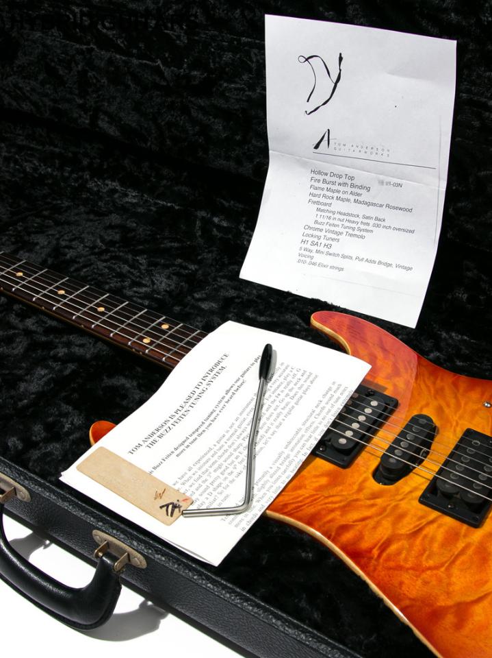 SuhrやJames Tylerと並んで人気のあるハイエンドコンポーネントギターブランドTom Andersonの2003年製 Hollow Drop Top Fire Burst with Bindingです。Switcherooと同様のサウンドバリエーションを持ちながら操作性の良い、5way、Add Bridge、Colil Splitの組み合わせです。