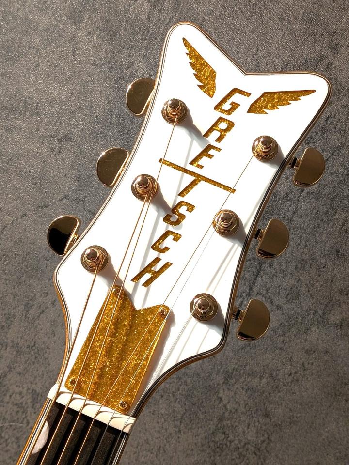 Gretschの象徴、そして「世界で最も美しいギター」と称えられるホワイト・ファルコンの意匠を完璧に継承。透き通るようなホワイト・フィニッシュに、眩いばかりのゴールド・スパークル・バインディングが縁取ります。