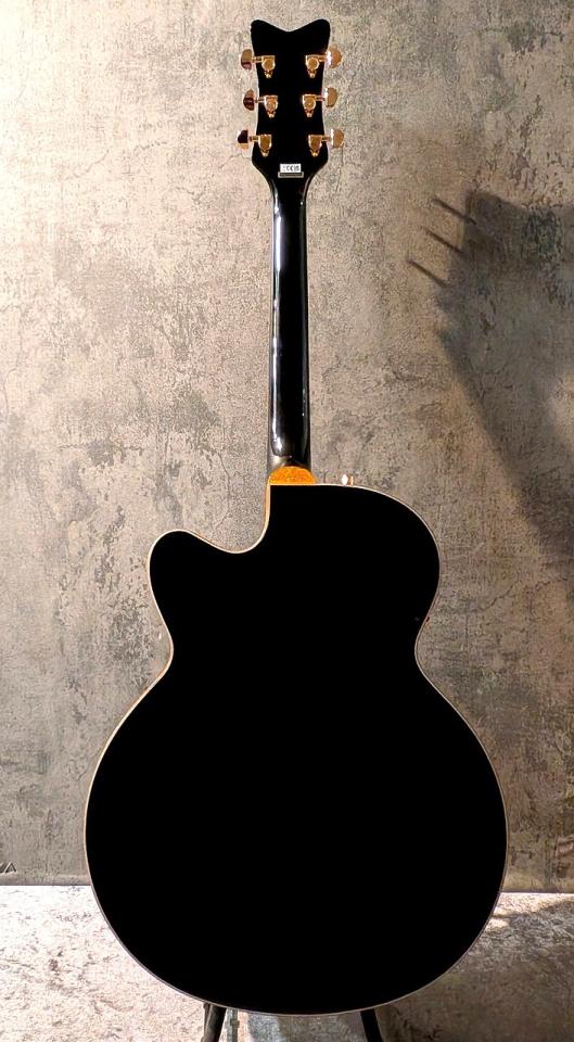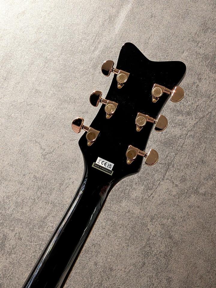 Gretschの代名詞とも言える「ホワイト・ファルコン」の漆黒バージョンを彷彿とさせるブラック・フィニッシュに、これでもかと言わんばかりに施されたゴールド・スパークル・バインディング。