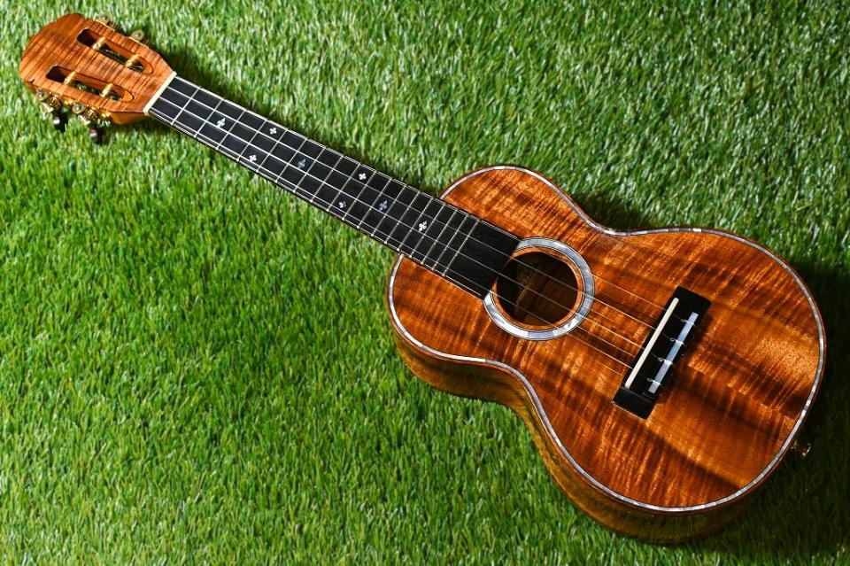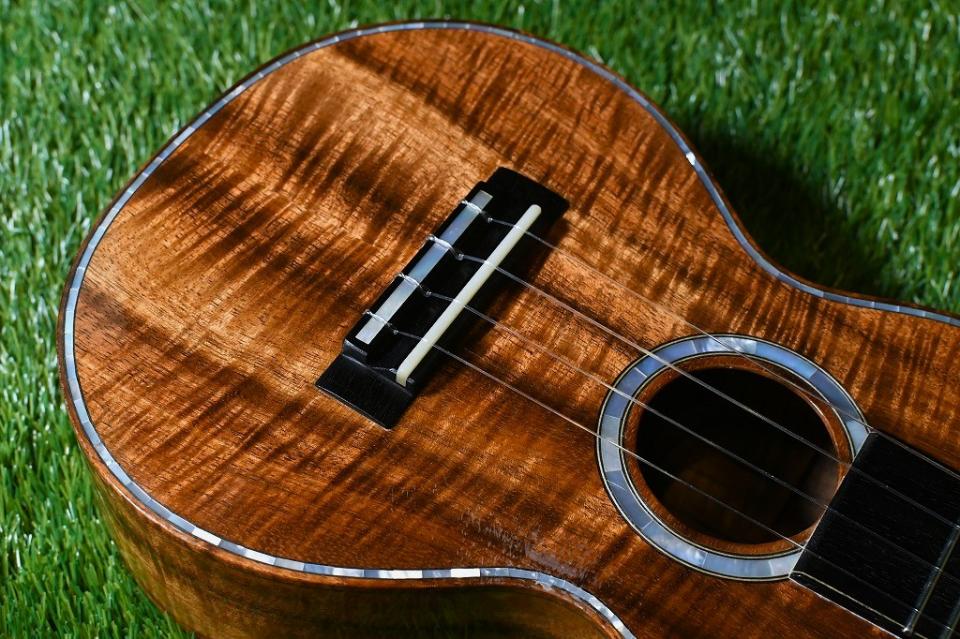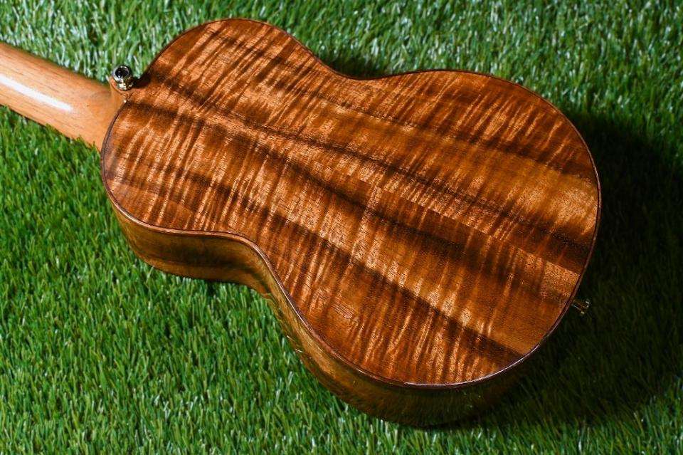 こちらのモデルは非常に綺麗なカーリーハワイアンコアで造られたスロッテッドヘッドのコンサートサイズです。