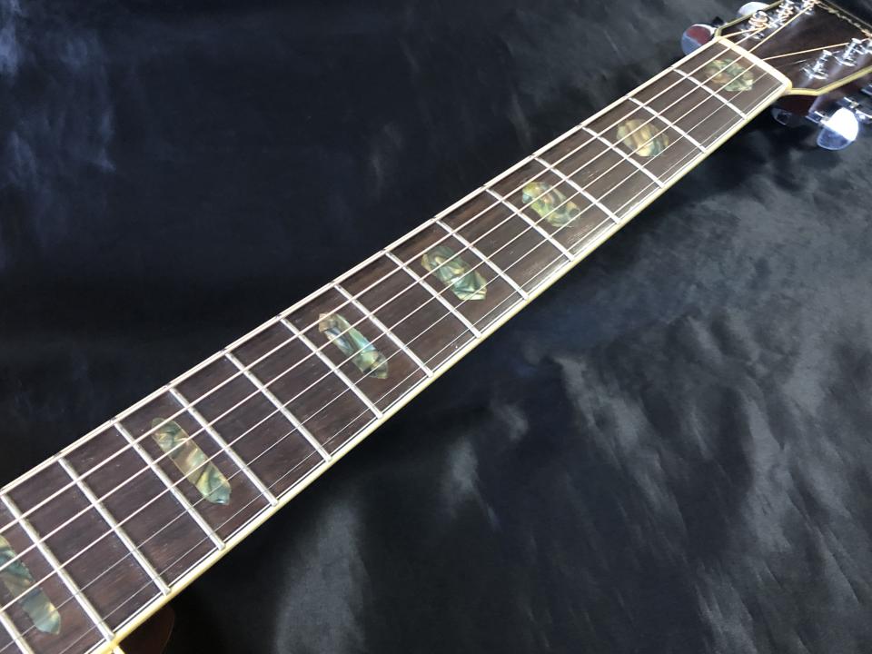 面取りされたべっこう柄のピックガードや、ボディトップ/サイド/バックに施されたアバロン風インレイ、また指板面のヘキサゴンインレイが高級感を演出しており、満足感ある外観です。