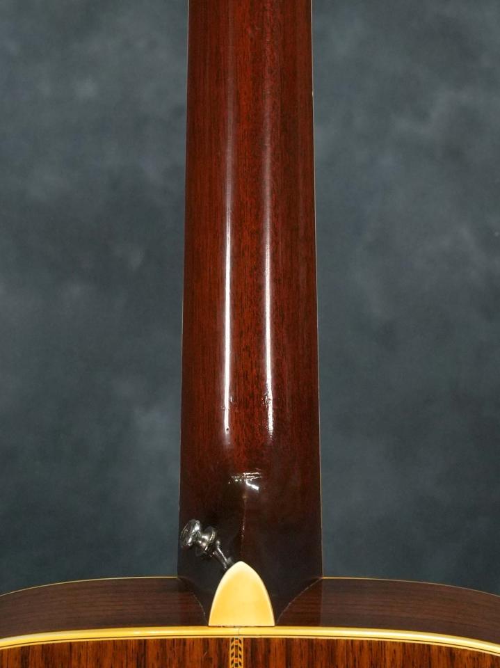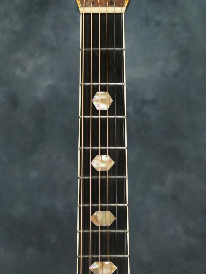 ジャーマンスプルースTop&インディアンローズウッドSide/Backのドレッドノートボディ、スクエアロッドの入った太身なマホガニーネック、エボニー指板、エボニーブリッジ、リアシフトしたノンスキャロップのブレーシング、パールによる指板のヘキサゴンインレイとボディトップのパーフリング&ロゼッタ。
