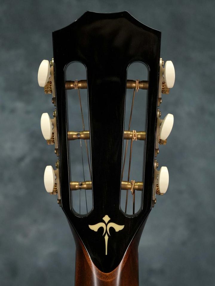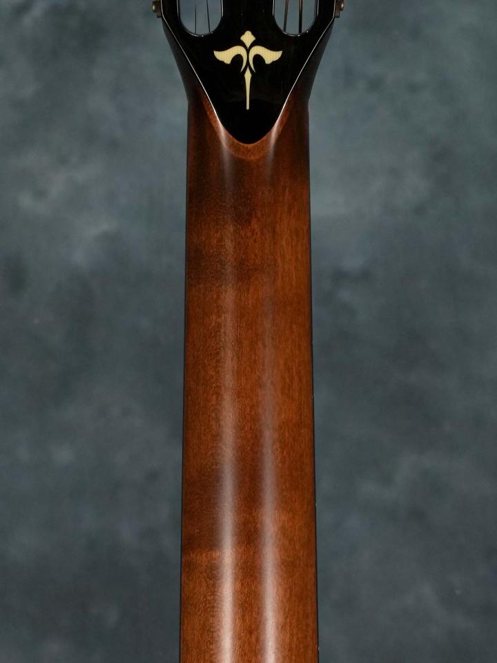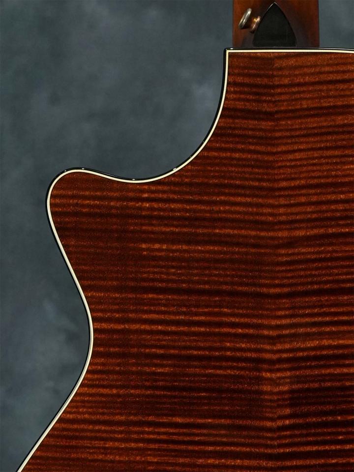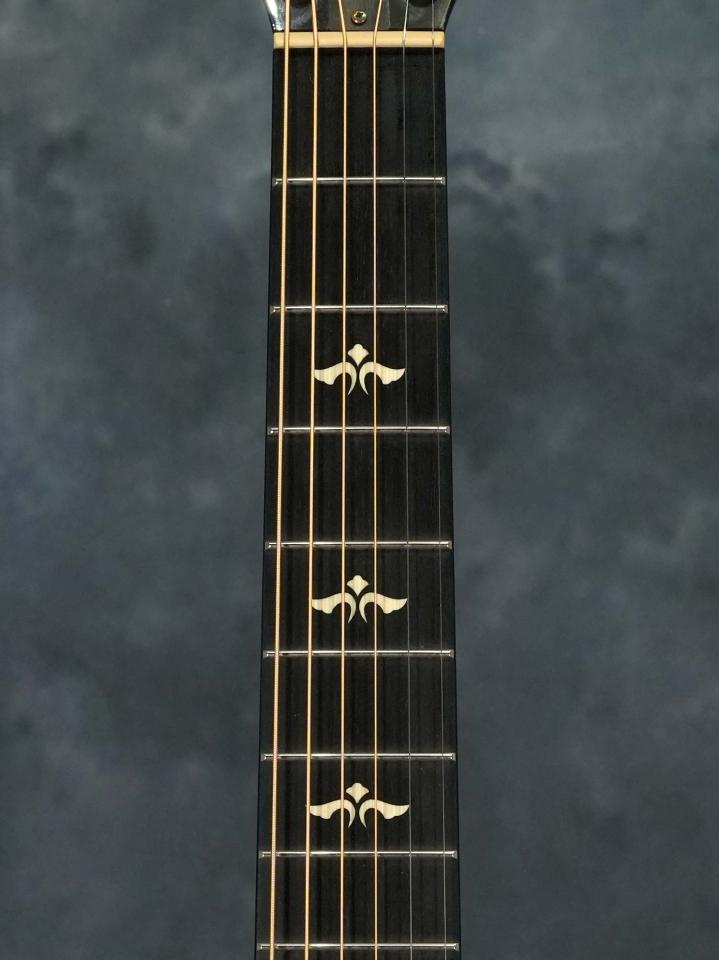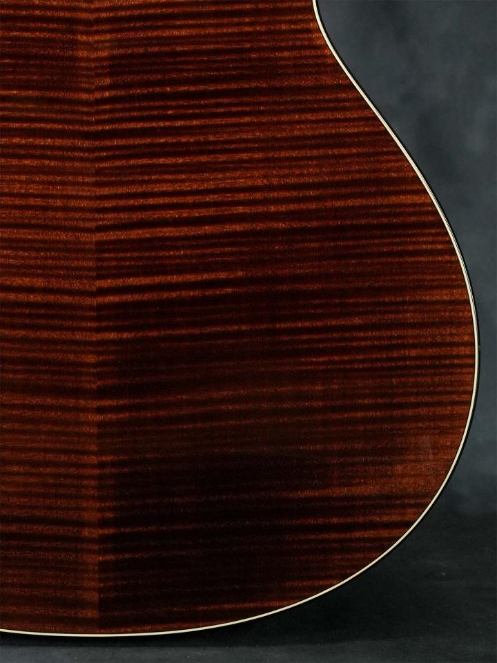 経年による変化を再現するトリファイド加工が施されたシトカスプルースTopに、どの角度から見てもピンストライプの美しい木目が映えるフィギュアド・ビッグリーフメイプルSide/Backの12フレットジョイント/グランドオーディトリアムボディ、ナット幅44.5mm(実測値)で24-7/8インチ(632mm)スケールでスロットヘッドのマホガニーネック、エボニー指板、エボニーブリッジ、特徴的な杢目の出たエボニーによるピックガード、2014年以降現行モデルでも採用されている「ES-2」ピックアップシステムを搭載。