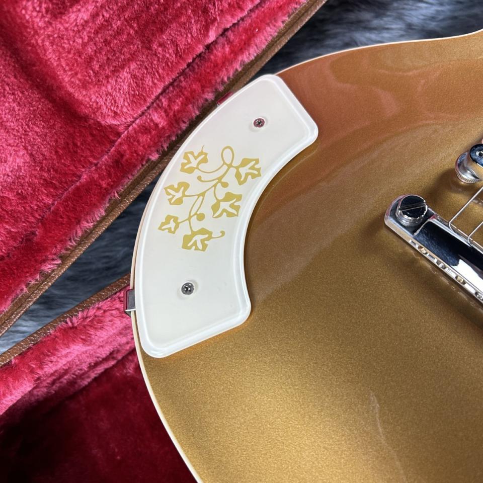 メアリーフォードモデルの特徴とも言えるフローラルアートデザインの特徴的なアームレスト、ピックガードを備えたゴールドトップレスポール。