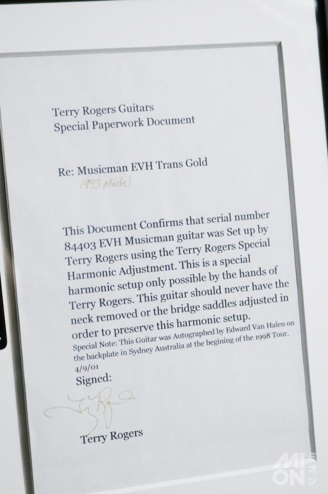この文書は、シリアルナンバー 「84403」のEVH Musicmanギターが、テリー・ロジャース(Terry Rogers) によって Terry Rogers Special Harmonic Adjustment (スペシャル・ハーモニック・アジャストメント) により調整されたことを証明するものです。