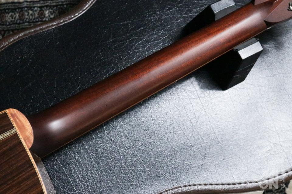 ネックはローポジションのみソフトVシェイプのニュアンスを感じる絶妙なグリップ感で、サラサラとしたサテン仕上げ。マホガニー特有のまとまりある中域と、サンタクルーズらしい豊かな倍音感を持ち、煌びやかさの中に甘く芳醇な響きを感じさせます。
