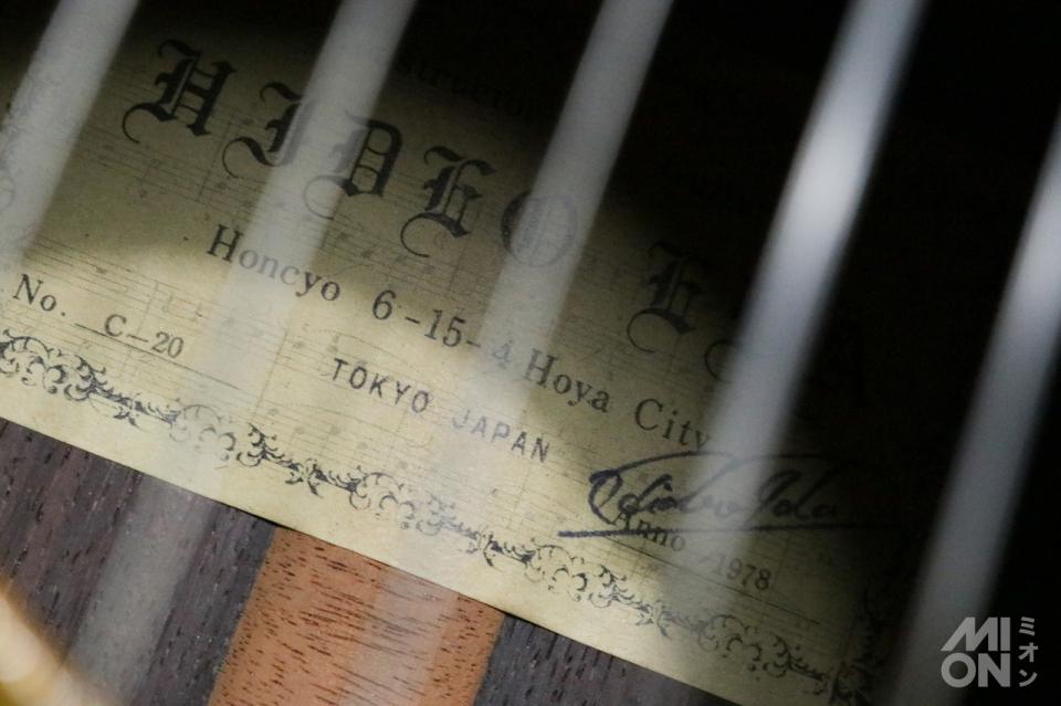 今回入荷したのは「C-20」、1978年製です。ラベルには「HIDEO IDA」とモデル名、製造年の記載、サインがございます。