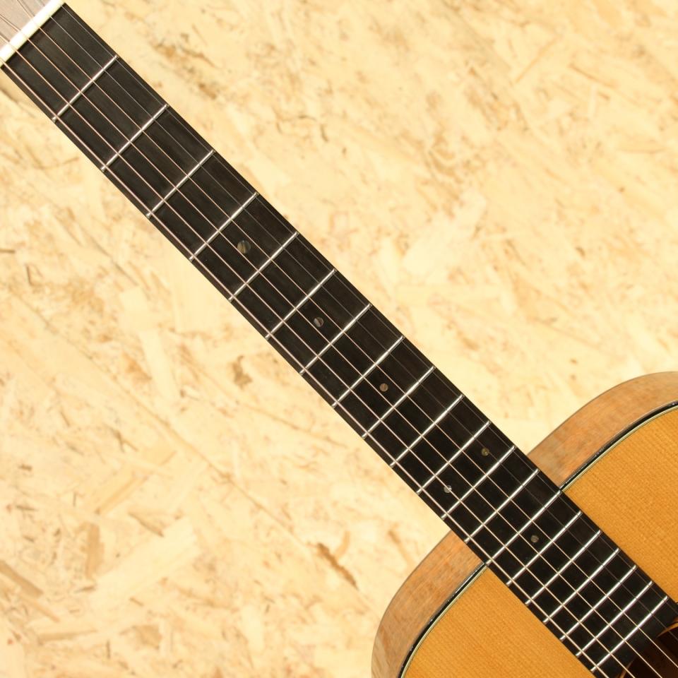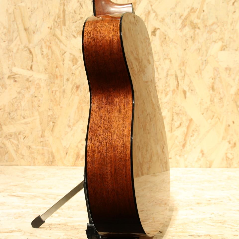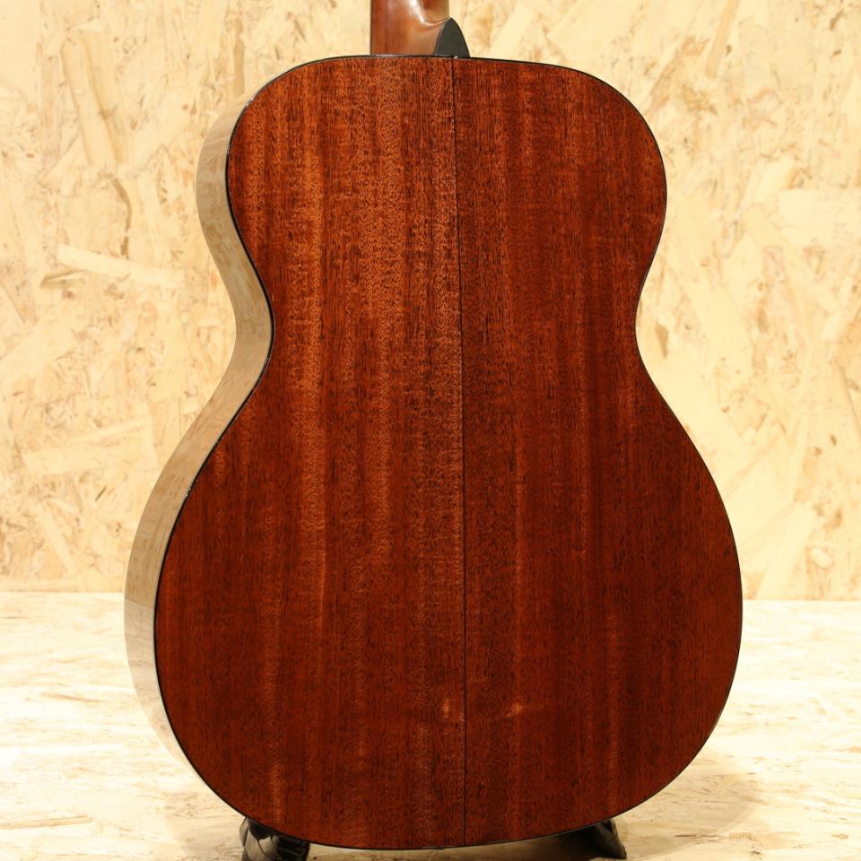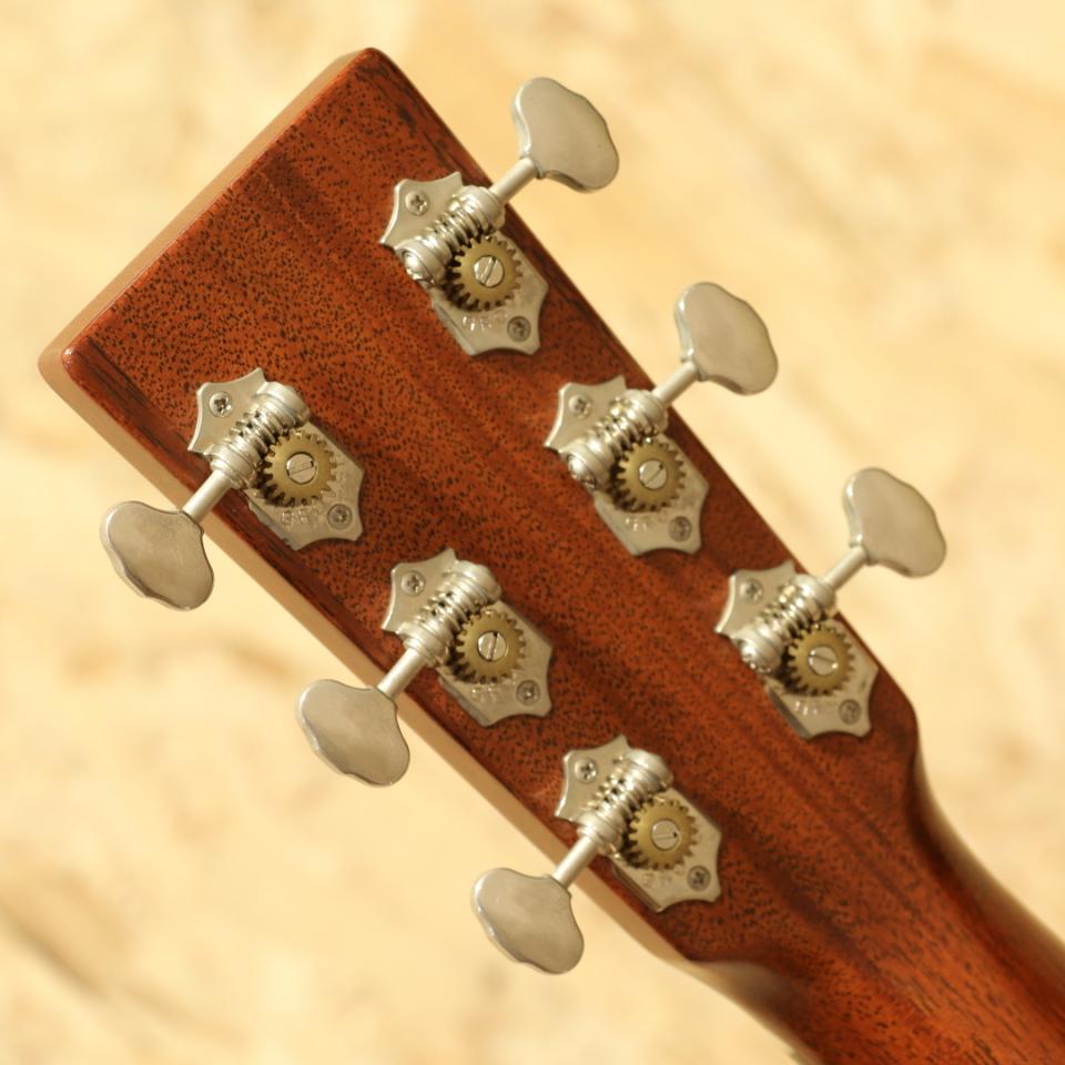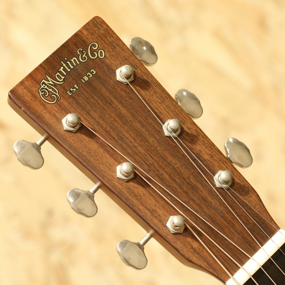 マーチンを代表する機種"OOO-28"と並び、もうひとつの側面を見せるリプルオーサイズのロングセラーモデル"OOO-18"。いくつもの仕様変更を繰り返した長い歴史の中で、本器は現行の1つ前の旧仕様。2017年製USED品。スプルーストップ、マホガニーサイド&バック、エボニー指板&ブリッジ、チェッカーフラッグバックストリップ、グローバーオープンバックペグ、オールドスタイル18ドット指板インレイ、べっ甲柄ピックガード、44.5mmナット幅、モディファイドローオーバルネックシェイプ、スキャロップドXブレイシング。オープンバックペグにべっ甲柄のピックガード、焼けた様な退色感のあるエイジングトナーなどオールドマーチンを思わせる外観に大きく深化した仕様変更を経たモデル。2025年からはより戦前モデルに近づいた仕様を与えられており、また異なる魅力を持っています。現行の最新仕様に比べてネット底面の形状、ブレイシングの形状、ブリッジ形状、ネックの僅かな形状など細部の違いは有れども基本スタイルは変わりません。現代基準の演奏性を確保するために44.5mmナット幅としつつ、薄平のグリップ形状とされています。サドルはショートサドル仕様とすることで、P.Uの搭載もし易い仕様に。そしてスキャロップドブレイシング特有の空気感を含んだオープンなサウンド。乾いた響きを軸として持ちつつ、やや艶やかさも感じる抜け感の良い音色。パシンと弾けるトーンが心地よく、弾き応えも充分です。28と比べてレンジ感や煌びやかさこそ抑えめですが、耳馴染が良く後味のさっぱりとした響きは18ならでは。ギターを前面に出した演奏、歌モノでのバックでの使用にもオールマイティにこなせます。派手さこそありませんが、それ故に通な方々に好まれることにも納得です。ボディくびれ4か所のバインディング剥がれに修正跡が見られますが、近年マーチンでは致し方無いでしょう。いずれも丁寧な作業が施されておりぱっと見では気付きにくい程キレイに修正されています。それに伴いボディバック面ネックヒール近くのバインディングが若干寸足らずにはなっておりますが、実用上は問題ありません。その他には6弦側ヘッド表の角に僅かな当てキズ、ペグのくすみ、全体的な薄い擦れキズと比較的使用感の少ない個体。ネック周りの演奏性も非常に良く整えられており、サドルでの弦高調整幅もまだ残されております。実用性の高いマホガニーモデルOOO-18。P.Uを搭載して使うも良し、家でのんびり弾くにも良し、硬派にマイク撮りも良いでしょう。バランス感の良いトーンと抱え易さから非常に人気の高いサイズです。お探しだった方は是非この機会にご検討下さい。