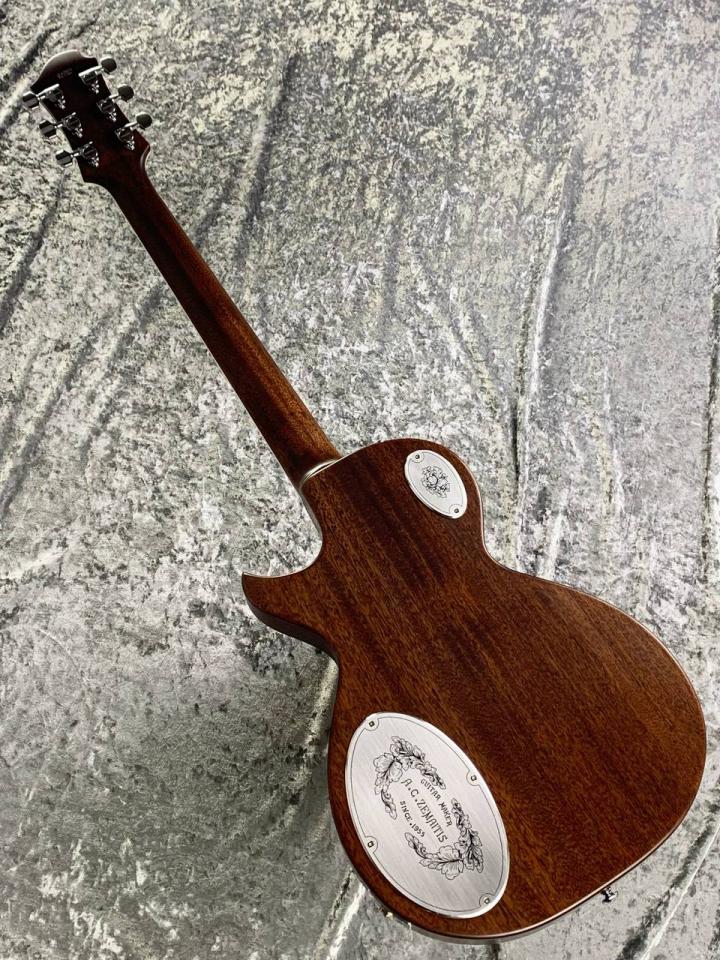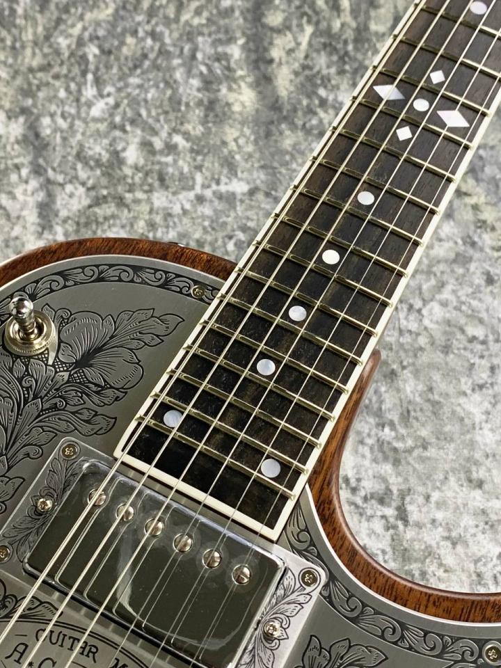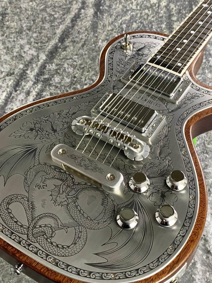 635mmのスケールで、セット・ネック・ジョイント、ミディアム・サイズの24フレット仕様で、ブリッジ後方に「Dragon & Heart」のデザインを採り入れたモデルです。