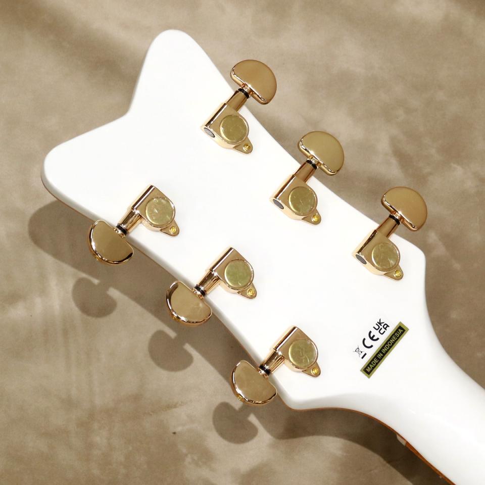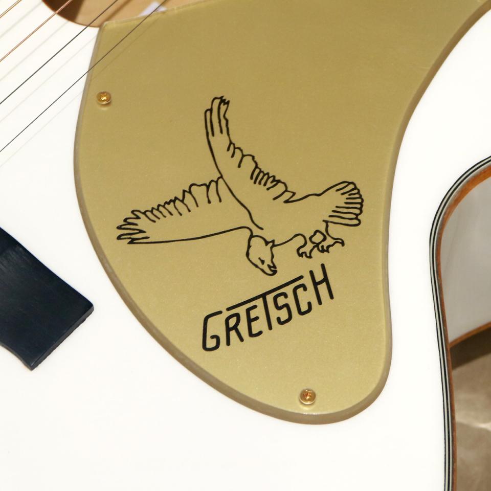 ファルコン・スタイルのVシェイプ・ヘッドにはグレッチ・ヴァーティカル・ウィング・ロゴが入り、ヘッド、ネック、ボディのゴールド・スパークル・バインディング、ピックガードにはファルコンのイラストとグレッチ・ロゴが入るなど、ゴージャスなファルコンのデザインを踏襲しています。