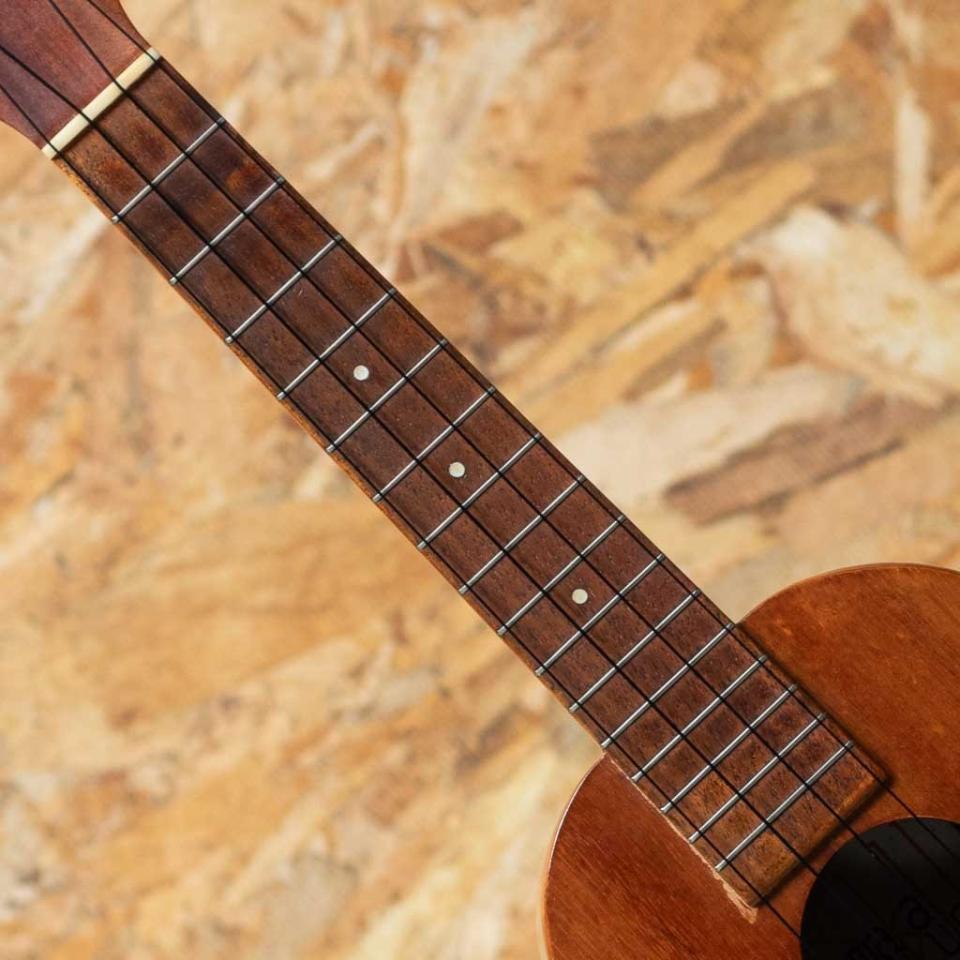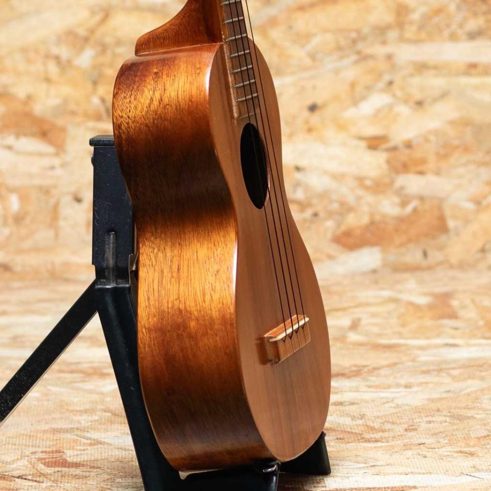 1960年代~70年代に製造されていたヘッドにTIKIと呼ばれる神様の彫刻が施されたレアモデル!数も少なく滅多にお目に掛かることができません。本器は1973年製ホワイトラベル、コンサートサイズの1本。ボディ、ネック、指板、ブリッジ、全てがコア材仕様。ドット指板インレイ、フリクションタイプペグ。甘くまろやかな音色ですが、経年の変化も手伝ってか、レスポンスも良く、ボリュームもしっかりとございます。ボディトップセンターシームにクラック補修が見られますが、裏側からパッチを当てた丁寧な修理がなされています。その他ボディサイドのエンド部分に質感を損なわない程度の塗装の修正が見られる他、細かい当てキズはございますが演奏性は問題ございません。珍しいTikiヘッドレリーフのカマカ、お探しだった方にはぜひおすすめしたい1本です。チップボードケース付属。