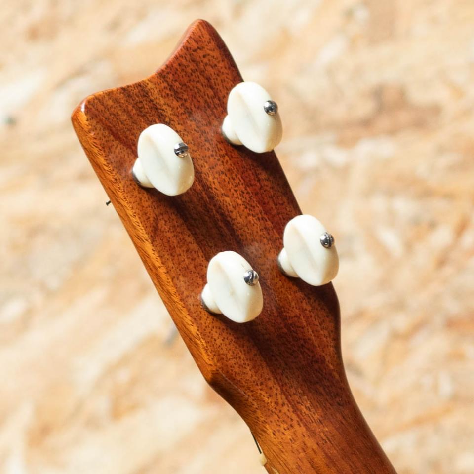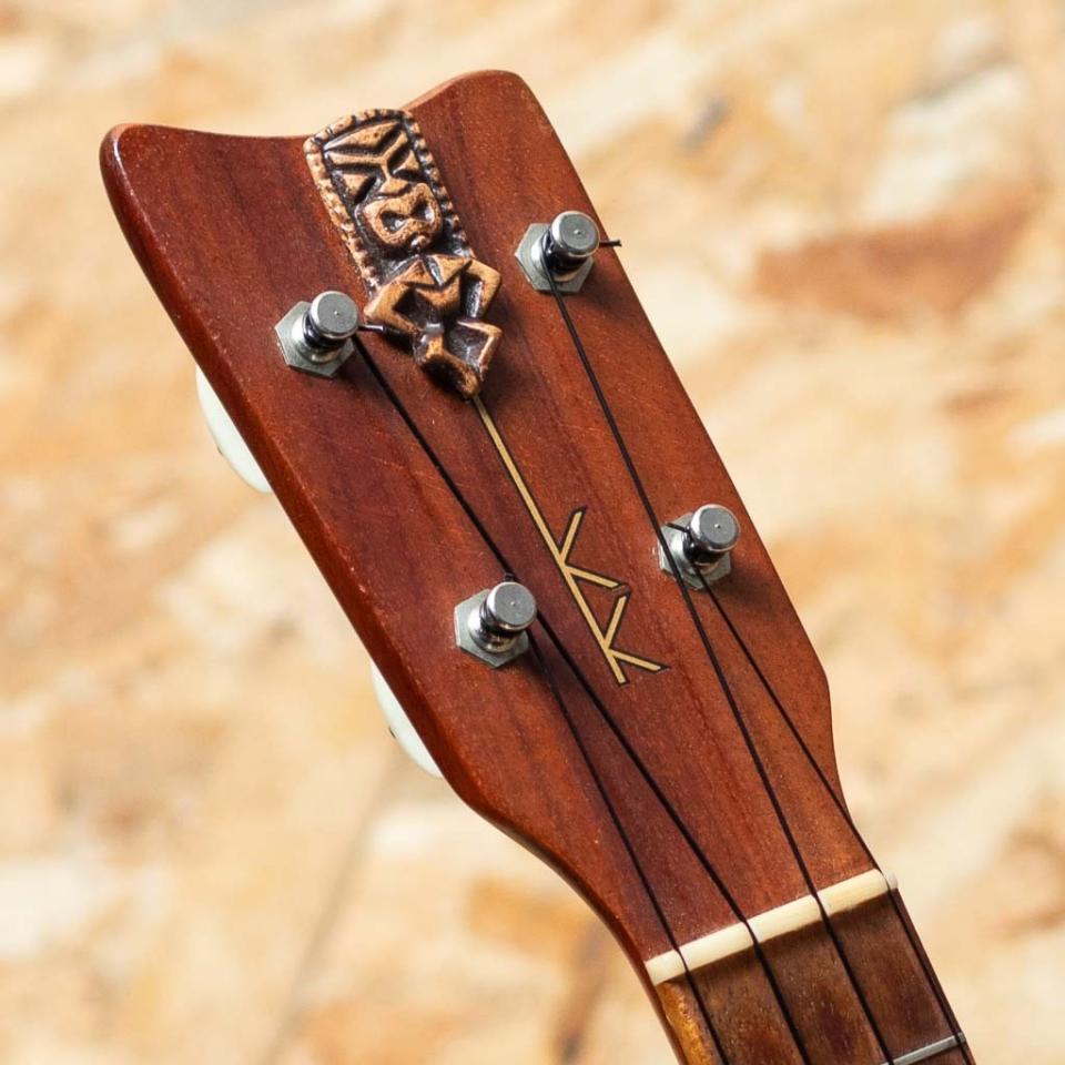 カマカホワイトラベルのTiki、コンサートサイズ。ハワイの神様”Tiki”の彫刻がヘッドにデザインされた、なかなかお目にかかれない珍しいモデルです。