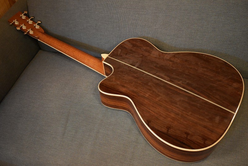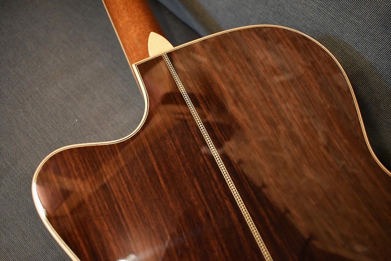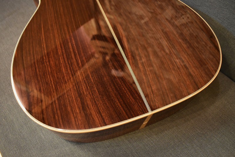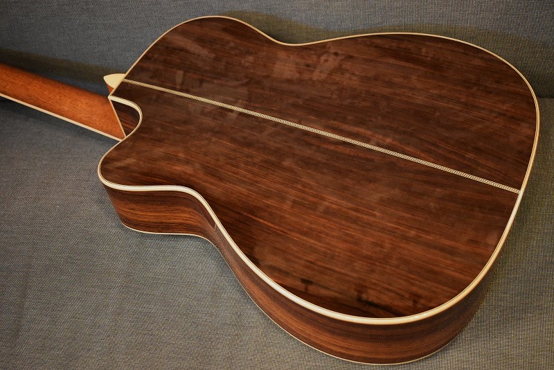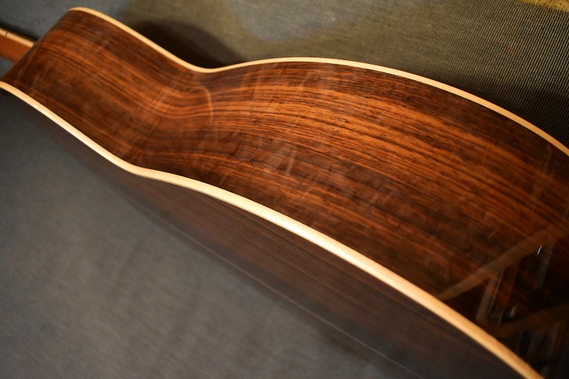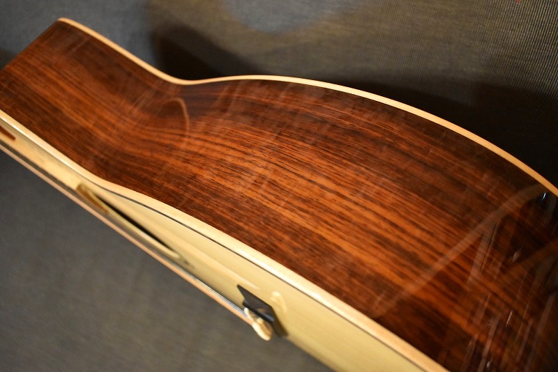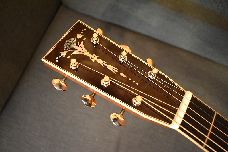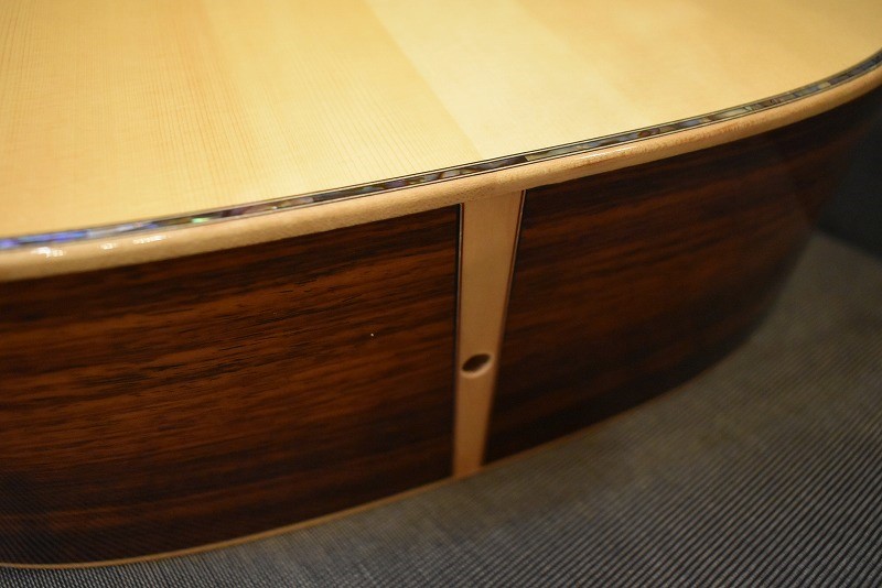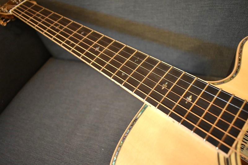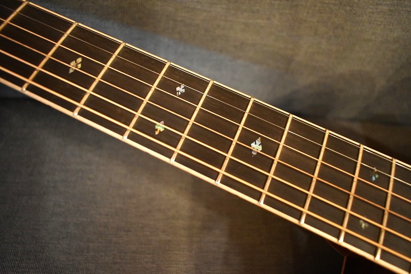 仕様としてはトップはジャーマンスプルース、サイド・バックはローズウッド。美しいメキシコ貝インレイと、見た目もゴージャスながらネックグリップの持ちやすさ、弾きやすさは格別でございました。