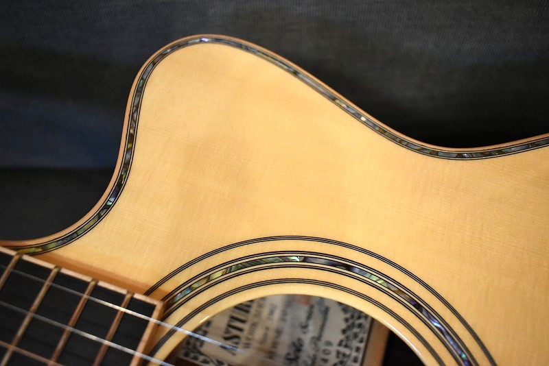 トップのジャーマンスプルースやメキシコ貝インレイ、カッタウェイモデルとなっており、見た目もゴージャスで美しい個体でございます。