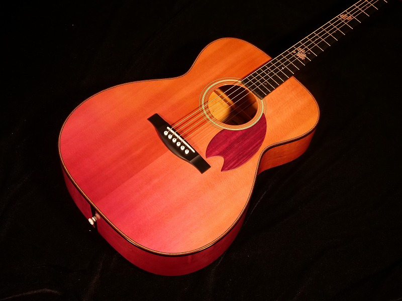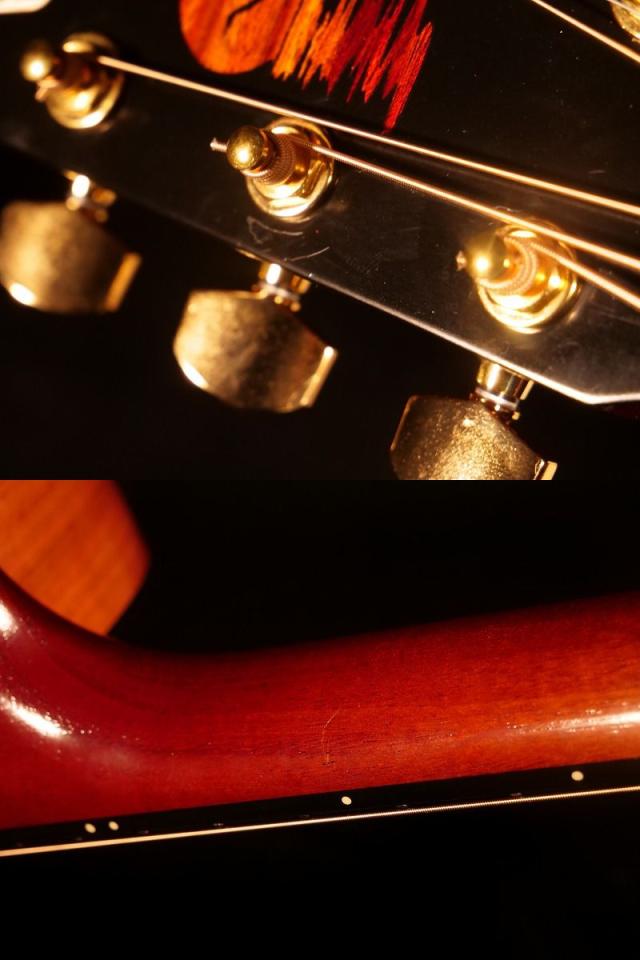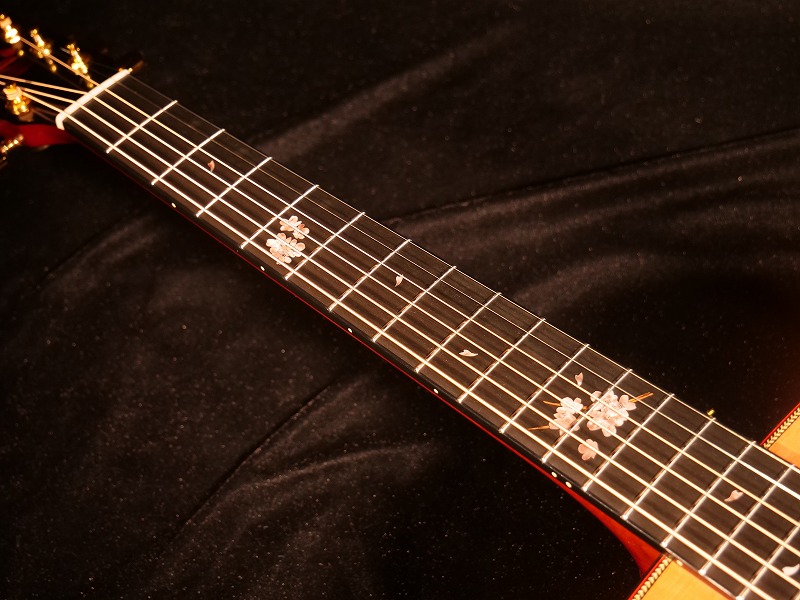 HFボディ(オーディトリアム)に、トップは杢目が細かく美しいシトカススプルース、サイド・バックは桜を採用、ネック/アフリカンマホガニー1P、指板・ブリッジ/リッチライト、セミフォワードシフトスキャロップドXブレーシング、ペグはゴールドのGOTOH(シャーラータイプ)を採用。