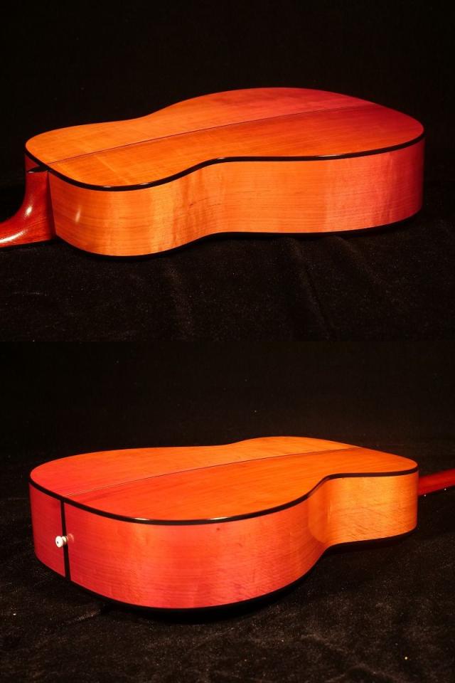 サウンドは小振りなボディとは思えない太く豊かな低音から、硬質な桜材の特徴でもあるシャープで明るく粒の揃った中高音のきらびやかな美しいサウンドで、極薄の漆塗装も相まって音抜けも大変良く、軽いタッチでも前にパーッン!と出るレスポンスの良さも特徴です。低音~高音共に芯があり透明感がある硬質でクリアな上品さも兼ね備えた上質なサウンドです。