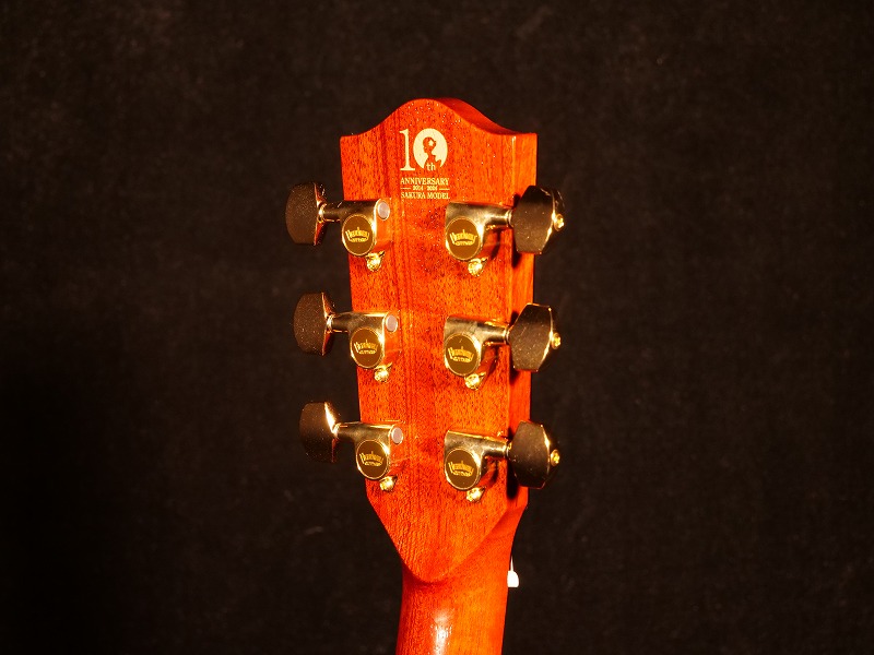 装飾も豪華でヘッド突板にはヘッドウェイのロゴと茜色の夕日をバックに飛び立とうとしている一羽の鶴が描かれています。指板には桜と花びらが舞っており、木製のピックガードは桜の形でバインディングにへリンボーンが施されています。ヘッド裏には「10thアニバーサリー」が入っており0(ゼロ)の中には和服の女性が描かれています。