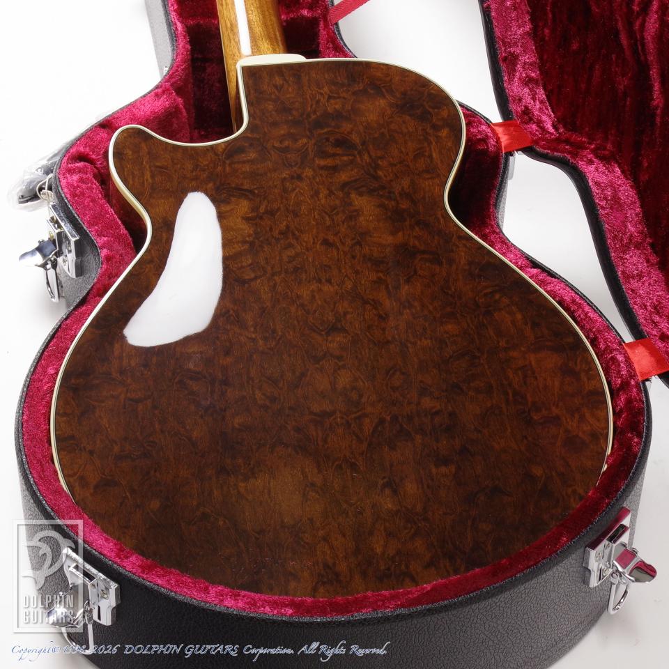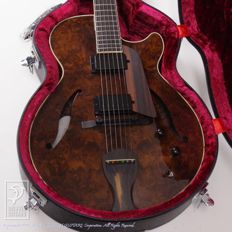 本器は15インチボディの2ピックアップ深胴フルアコ、JF15 2HB Imbuia Burl。