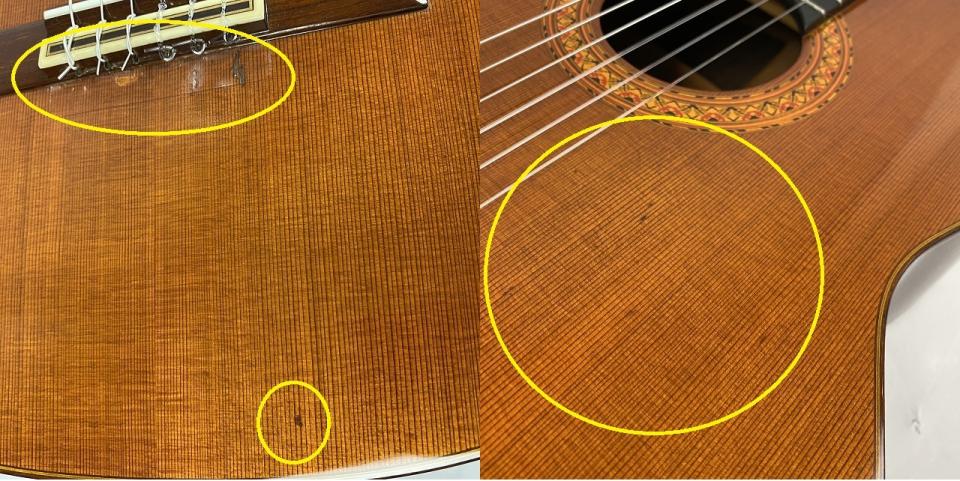 ・キズ・使用感:年数相応の使用感はありますが状態は良好です。傷、打痕あります。TOPに傷(弦飛びキズと表面板を中心に小さい演奏キズ)あります。TOPのみ個人製作家により塗り直しされております。