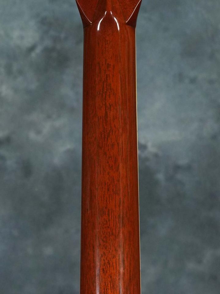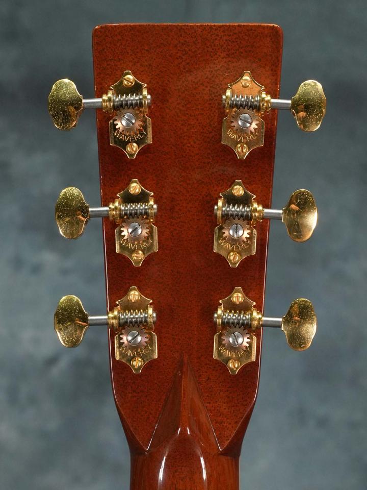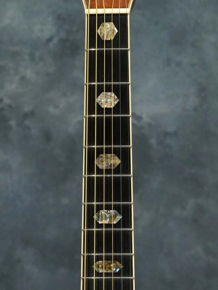 アディロンダックスプルースTop&マダガスカルローズウッドSide/Backの14フレットジョイントドレッドノートボディに、アディロンダックスプルースによる「リアシフト」したスキャロップブレイシング、ベッコウ柄ピックガード、ナット幅44.0mm(実測値)かつ薄みなLow Profileシェイプのセレクトハードウッドネック、エボニー指板、エボニーブリッジ、滑らかな回し心地のWaverly Gold 4060 チューナー、指板のヘキサゴンインレイ・ボディのトリム&ロゼッタには厳選されたアバロンパールが使われており、やや黄色がかったエイジングトナーフィニッシュとの組み合わせによりStyle 45ならではの落ち着いた高級感のあるデザインに仕上がっています。