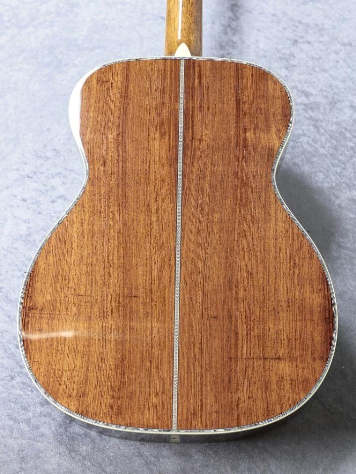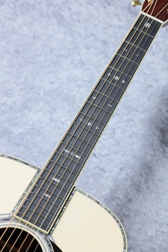 【CTM 000-45 Itarian Alpine Spruce ×Honduran rosewood】木材とネックシェイプに拘った当店オリジナルのカスタムオーダー品。トップ板の経年による色味の変化を楽しめるクリアフィニッシュのトップに、最高グレードの杢目が整った美しいイタリアンアルパインプルース。サイド・バックには同じくMartin社所有の最高グレードのホンジュラスローズウッド。目が細かく鮮やかな美しい杢目は見ているだけでも楽しめてしまう美しさ。特にこの個体は程よくうねりのある美しい柾目に近いホンジュラスローズウッドを使用しており明るくも重厚な粘りのあるサウンドに繋がっています。最高グレードの木材と煌びやかなアバロンインレイの響きを最大限まで活かすために極薄ラッカーの”シンフィニッシュ”を採用。新品なが膜のとれた鮮明なサウンドも魅力です。ナット幅は44.5mm幅、ネックシェイプは適度な厚みと手になじみやすい仄かなVシェイプを持ったModified Low Oval。ハイポジションが従来より細めの幅でネック全体の演奏性を高めたハイパフォーマンステーパーも採用。さらにボディの響きの個性を左右するブレーシングには薄く加工されたスキャロップドブレイジング。こちらもヨーロピアンスプルースを使用。さらにすべての工程を手作業かつ滑らかに加工を施したGolden Era スタイルのブレーシングを採用しています。手作業で丁寧に削りこみ、磨き上げることでトップの振動を妨げることなくトップ板の剛性を生み出しています。
