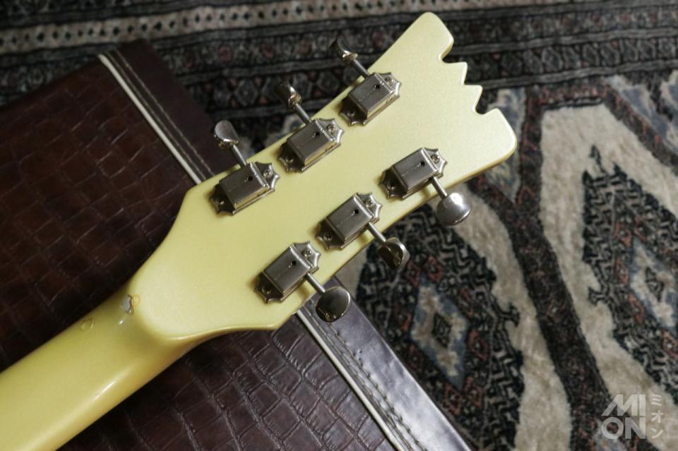 63年仕様の象徴であるセットネック構造。ヘッドには「The Ventures Model」ロゴが、そしてトレモロには「VIBRAMUTE」と入っています。アウトプットジャックはサイドで、ピックアップは「3000F」「3000R」を搭載。ロゴはピックアップには入っていません。また、クルーソンタイプのペグには「mosrite」と小さく刻印されています。