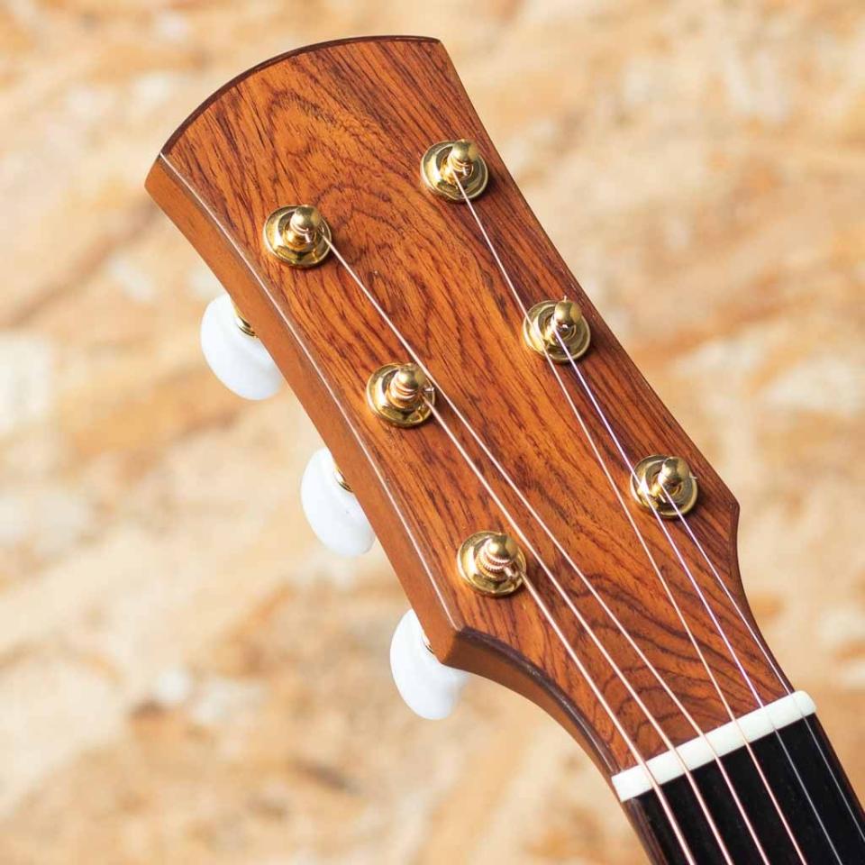高級なオールハンドメイドギターでしか味わうことができなかった繊細なトーンをリーズナブルに。ベトナムで製造するブランド、”エアーズ”。完全手工にて生産されるハイコストパフォーマンスなブランドです。本器は約16インチロウワーバウトのスモールジャンボデザイン、"SJ08"2020年製USED品。シトカースプルーストップ、ベトナムローズサイド&バック、マホガニー1Pネック、エボニー指板&ブリッジ、アバロンロゼッタ、ウッドバインディング、Xブレイシング、サテンフィニッシュ。ネック自体は薄めに成形されており、演奏性高く複雑なフレーズでも対応の出来るシェイプ。約44㎜のナットはフィンガースタイルからストロークと幅広く楽しめる標準的さ。ソロギターなどフィンガーでの細やかなフレーズのフィンガリングでもスムーズな演奏が可能です。SJデザインのボディサイズはOMサイズより多くの空気感を含んだトーン、広いレンジ感で濃厚な低音成分を体感できるボディシェイプ。本器はオプションとしてバンジョーペグを採用したカスタムオーダー仕様。サイドバックのエキゾチックな杢目とも相まって個性的でユニークな魅力を持っています。ボディトップの指板両サイドやブリッジした周辺にウェザーチェックが見られます。使用感はあまり感じられず弾きやすいセッティングでプレイコンディションも良好です。インパクトのあるルックスの1本。オリジナルハードケースが付属です。