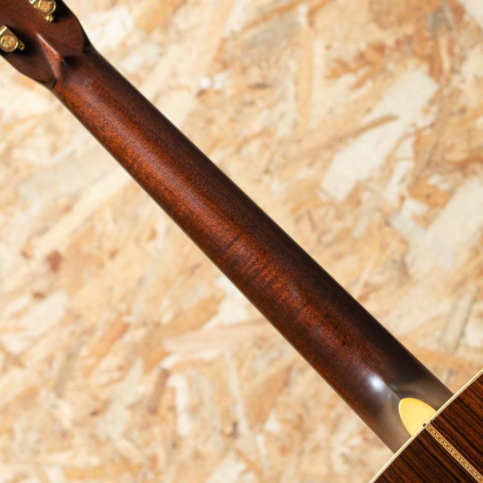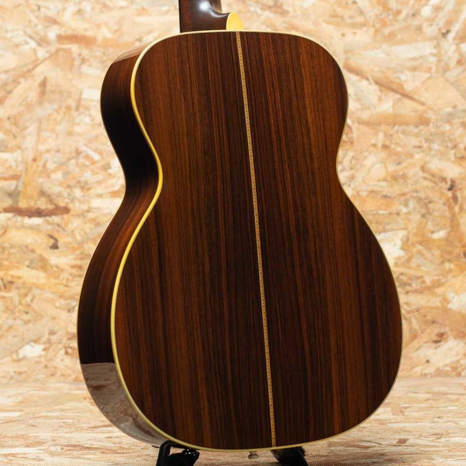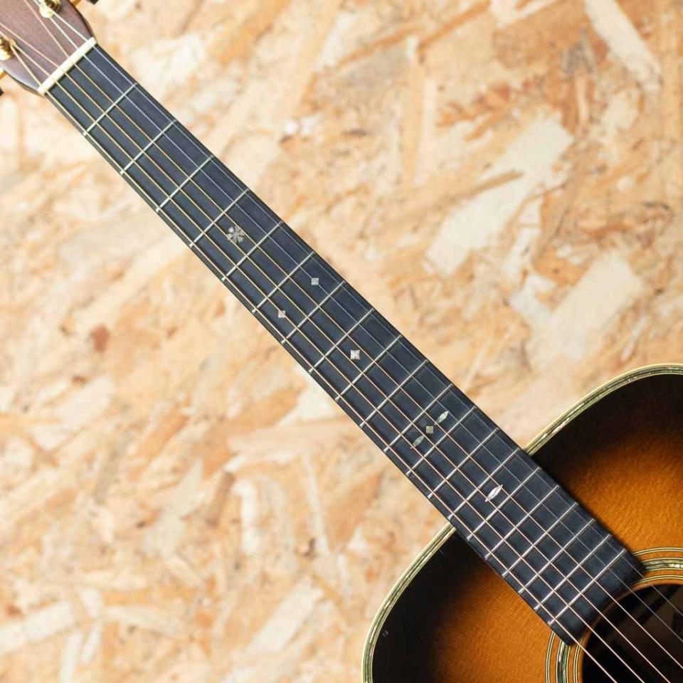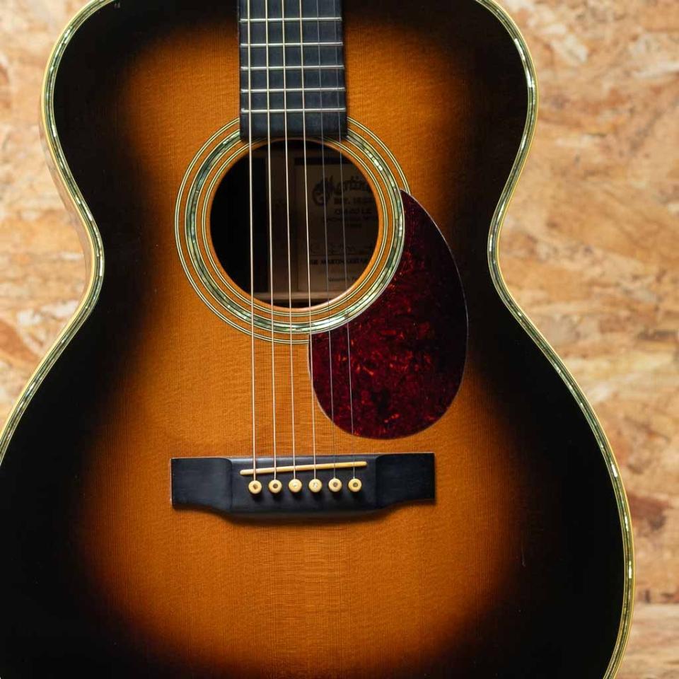 1984年から1990年代前半にかけて実施されたギターオブザマンス(Guitar of the Month)。既存のスタイルをベースに特別仕様化したモデルが毎年数種類、製作されました。本器は1994年ギターオブザマンスの1本”OM-40LE サンバースト”。こちらはナチュラルフィニッシュが57本、サンバーストが29本のみ生産されました。スプルーストップ、ローズウッドサイド&バック、マホガニーネック、エボニー指板&ブリッジ、オリジナルインレイ入りエボニーボタンマーチンゴールドペグ。トップのトリムとロゼッタはソリッドアバロンを二重に重ねる贅沢仕様。ヘッドロゴ、ペグボタンにまで貝を使用した何ともゴージャスな1本です。過去にダブルピックガード仕様になされた痕跡があり、現在は追加のピックガードは外されていますが薄っすらとトップの日焼け感の違いが確認出来ます。また、トラスロッドはすでに限界まで締めておりますが現状のネックコンディションは良好で弦高も標準的な設定です。トップ下部にやや目立つ打痕があるものの割れなどの大きなダメージはなく、OMらしい張りのあるトーンと艶やかなサウンドを存分にお楽しみいただけます。中々市場に出回らない1994年度ギターオブザマンス、”OM-40LE” のサンバーストフィニッシュ。ぜひご検討くださいませ。