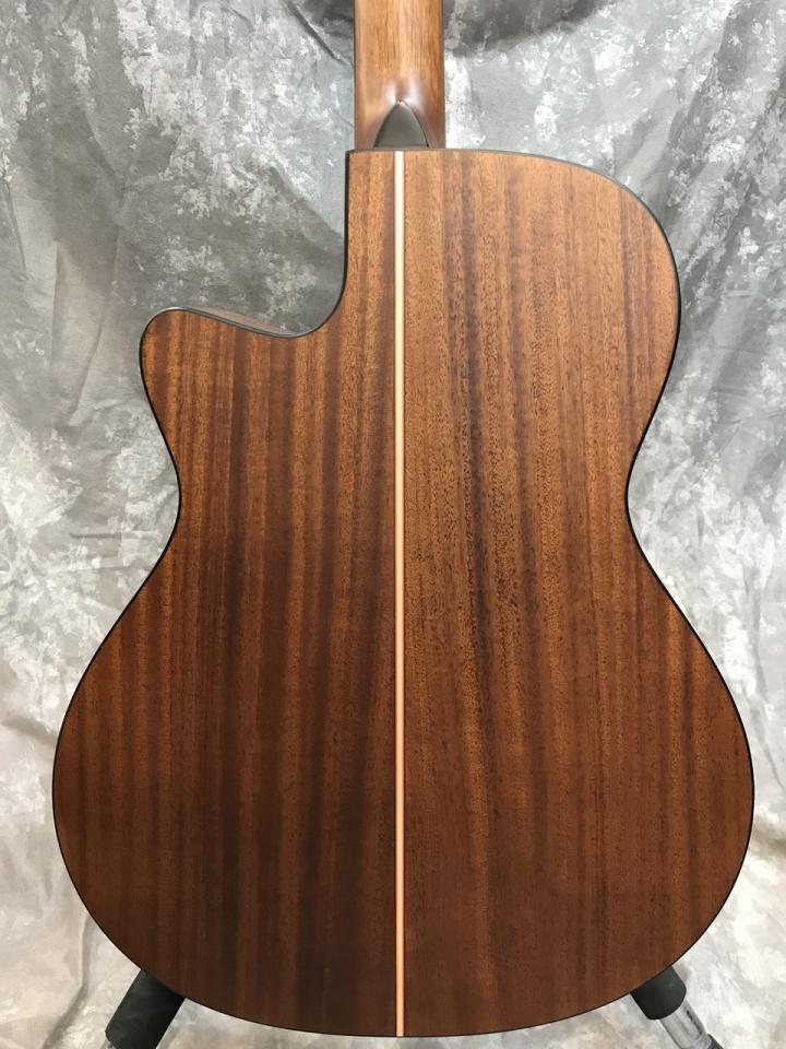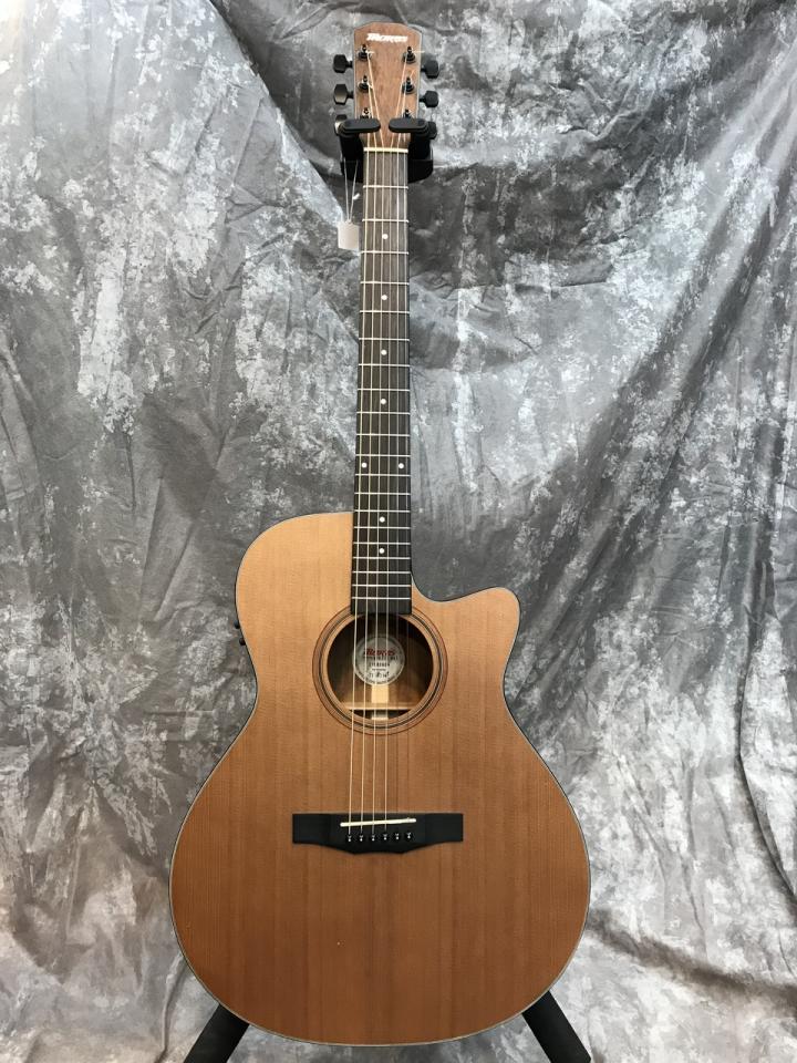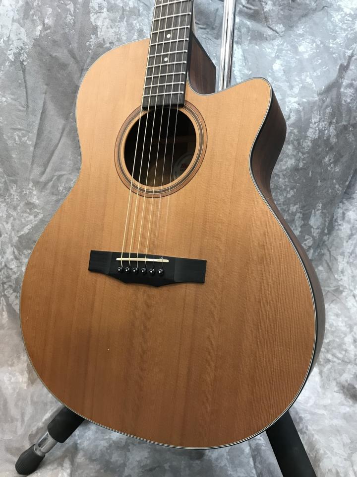 ボディはフォークサイズを採用し、カッタウェイが採用されており、取り回しの良さと快適な演奏性が特徴。トップにはシダー、サイド&バックにはマホガニーを使用し、明るく輪郭のある高域と、まとまりのある中低域をバランスよく出力します。軽いタッチでも反応しやすく、自宅での弾き語りやフィンガースタイルにも適したサウンドです。