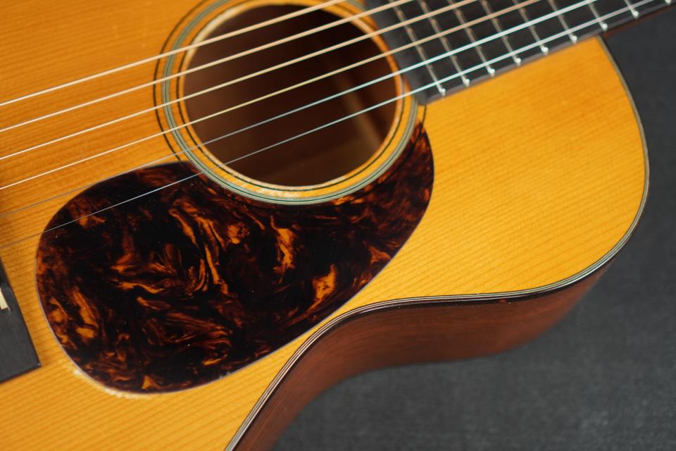 ギターの顔の一つとも言えるピックガードは戦前と全く同じような色合い、形を再現しています。このピックガードはPre war Guitarsが製作しているオリジナルのピックガードで、他のメーカーのピックガードとは違い、とてもリアルな質感、雰囲気です。