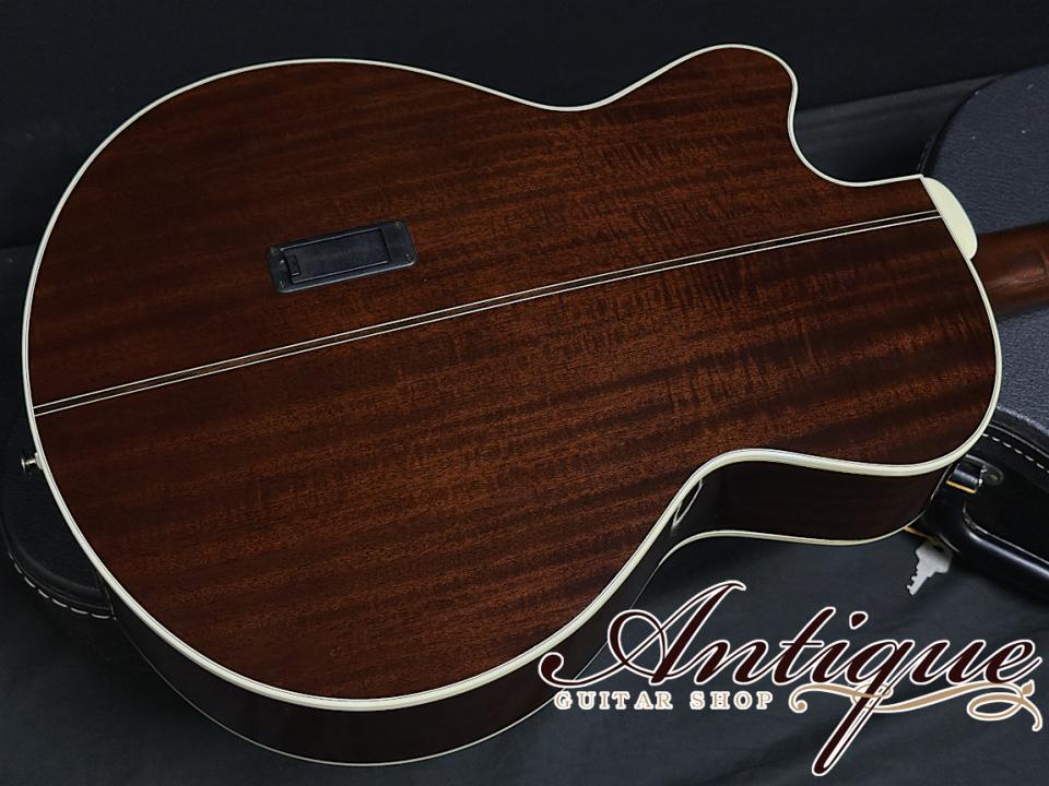そしてその気になるサウンドとしては、コンパクトサイズながら厳選されたウッドマテリアルと深胴ボディのポテンシャルを最大限に引き出した素晴らしい鳴りに驚かされます。元々なのか弾き込まれてきたせいなのかは分かりかねてしまいますが、本当に良く鳴ります。また搭載されたピックアップにはギターそのもののサウンドを再現するHighlander IP-Ⅰを採用。一般的なアンダーサドルタイプでは弦振動をメインに拾い上げて出力される中、こちらはその特殊なマウント方式から弦振動はもちろん、楽器全体の振動を拾いあげ、よりナチュラルでより繊細なニュアンスをアウトプットします。サウンドキャラクターとしては、ありがちなアコースティックサウンドの良さを挙げるよりも、坂崎氏ご本人のサウンドそのものという表現が何より相応しく、是非当時(2000~2003年頃)のツアービデオやライブビデオでのサウンドと比べて頂きたいと思います。