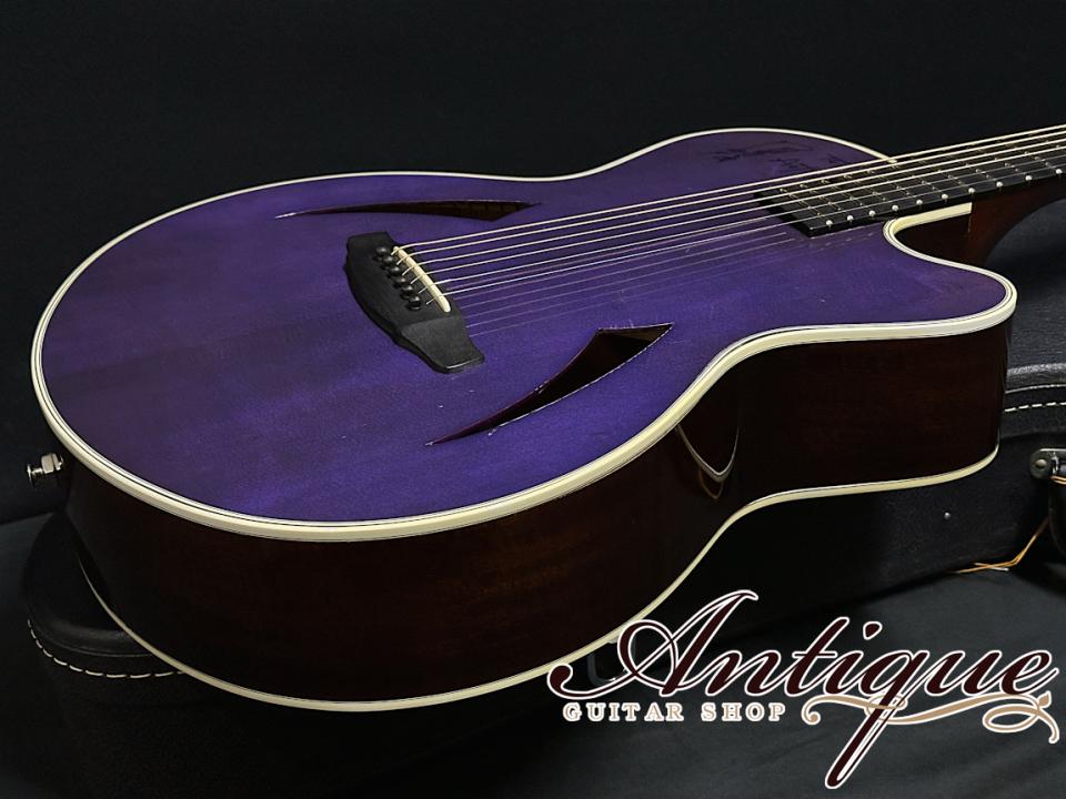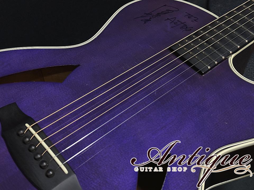 今回ご紹介させて頂くのは、2000年に登場した当時のESPとしてはおそらく初のアコースティック構造となるAS-300モデル。(カスタムオーダー等を除く)THE ALFEE 坂崎幸之助氏のエレアコ・シグネイチャーモデルとしての初号機となるパープルトップの希少な一本。実際にAUBE2000ツアーより様々なナンバーで頻繁に登場し、レコーディングやライブ等で愛用されてきました。その後同モデルにてグリーントップやブラックトップのモデルが販売されましたが、やはり初号機となるパープルトップに関してはファンが手放さないという理由、受注生産品(Built To Order)かつ生産完了モデル(Discontinued Model)という事もあり、市場流通は極めて少なくなっております。またボディトップには本人直筆のサインが入れられているという点もファンには嬉しいポイントとなります。