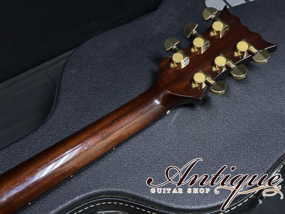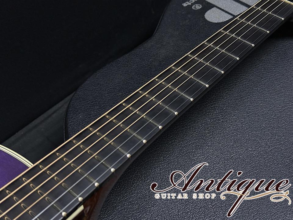 まずそのスペックとしては、杢目間が広く所謂クォーターフラワーライクなギラつきを持った良質なスプルースをトップに、ボディサイド&バックには今で言うリボンマホガニーの様にシッカリとフィギュアドが浮かぶ極上のマホガニー材を採用。フィニッシュカラーには、坂崎氏本人もAUBE2000ツアーより長く愛用した一本同様となるトランスパープルカラーを採用。一見してベタ塗りながらもシースルにて下の杢目もシッカリと見える非常に渋い仕上がりとなっております。続いてネックにはボディ程ではありませんが、ギラつきを感じさせる良質なマホガニーに、強度を高めるネックボリュート、ヘッド形状は特徴的なオリジナルシェイプにてブランドロゴが施されております。指板には今ではどこのブランドも確保が難しくなってきている王道の高級材であるエボニーを採用。以降のグリーン、ブラックのモデルではこちらがローズウッドになっていることもあり、初号機に関しては特に高いウッドマテリアルにて構成されているのが伺えます。その他としては約355mm(≒14”)のボディサイズに、ボディエンド部約89mmの深胴、24 3/4”スケールにミディアムジャンボの20F仕様、ボディトップ&バック共にはマルチバインディングが施されております。サウンドホールはノンバウンドのキャッツアイタイプ、エボニーブリッジにエボニーブリッジピン、ゴールドチューナーとファンには堪らない本人同様のスペックとなっております。