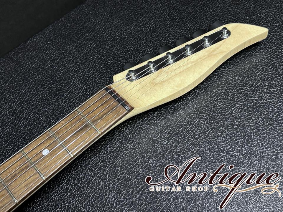 まずそのスペックとしては、基本的には最新スペックのTALBOに準じており、独創的なシェイプを採用し、ボディにはアルミ鋳造1ピースのホロウ構造ボディ(Cast Aluminum alloy AC-4B)、こちらにJoe Satrianiの愛用するIbanez Chrome boyと同じ工房にてクロームメッキ塗装が施されます。もちろん拘りはフィニッシュだけでなく、”Talbo”ロゴもシッカリとリデカールされております。続いてネックにはメイプル材が採用されておりますが、トーン重視のフラットソーン(板目取り)にて、角度によってフィギュアドライクなギラつきを魅せる素晴らしい材となっております。指板のローズウッドもコントラストが濃く、黒の強い杢目も走る良質な材を採用。その他としてはヘッドトップ・プレートにマウントされたGotoh製マグナムロックチューナー(SG381-07 MG-T)、Wilkinson製シンクロトレモロ(VS100N)、ブrックのグラフテック・トレムナット、ダイレクトボルトオンジョイント、クリアバックプレート、また以前の仕様からアップグレードされた、214H形状の22F仕様、ネックセット、ネックグリップ、ストリング角度を革新した高いプレイアビリティと、ストリングガイドが無いにも関わらず1~6弦までで均一に近いテンションを獲得しております。