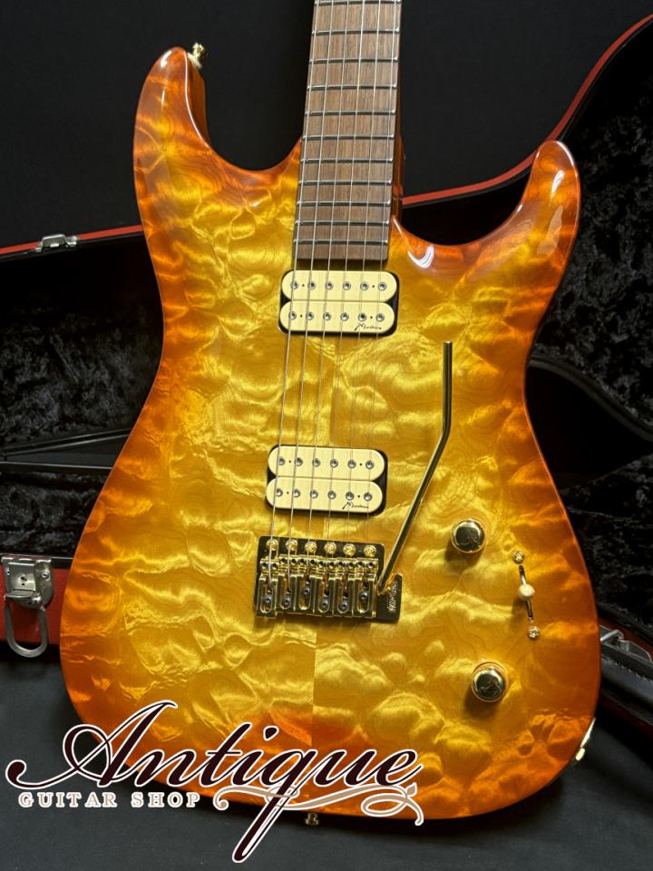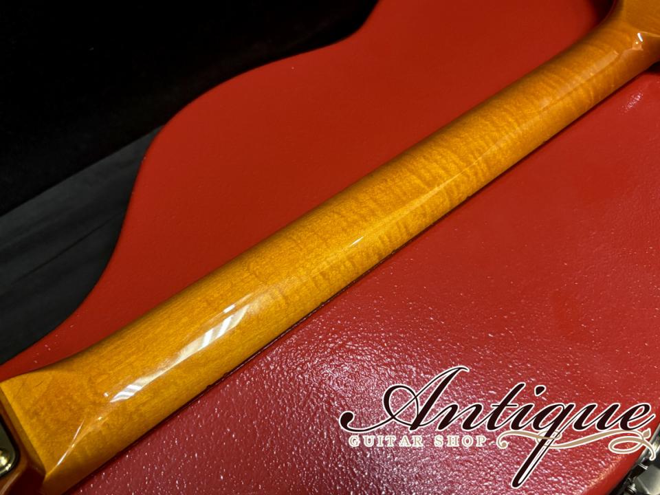 まずそのスペックとしては、美しいグラマラスなアーチドトップスタイルにて、ボディトップにはエキゾチックな大粒キルトフィギュアドメイプルが採用され、これでもかと思える程に3Dに揺らめき動く、まさに珠玉と呼ぶに相応しい最高峰グレードの材を採用。ボディバックにはヴィンテージでもお馴染みのホンジュラスマホガニーが採用されておりますが、こちらも各所にフィギュアドが浮かぶ極上材。フィニッシュカラーははAmberとなりますが、こちら実際にはアウトラインのコントラストが強いバースト系フィニッシュとなっております。続いてネックには霜降り系の3Dフレイムがガッツリと入ったフィギュアドメイプルを採用。加えて硬質な材の証でもあるフレックラインも確認出来る最高峰の材となっております。もちろんヘッドにもフィギュアドフレイムが浮かびますが、こちらはボディ同様のマッチングフィニッシュとなっております。そして極めつけとして指板には極上過ぎるハカランダ(ブラジリアンローズウッド)を採用。ダークなコントラストの中に強い黒の杢目が入り、オイリーなツヤ感も感じさせる素晴らしい材が採用されております。その他としては、指板ポジションマークは無し、ウィルキンソン・シンクロナイズドトレモロ、スパーゼルロッキングチューナー、ジャンボフレットのツバ出し22F仕様、そしてハードウェアはゴールドで統一と、一切の妥協を感じさせない豪華極まりない一本となっております。