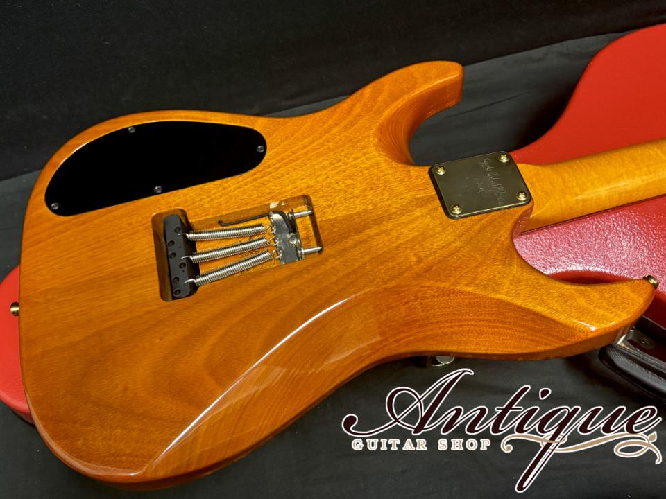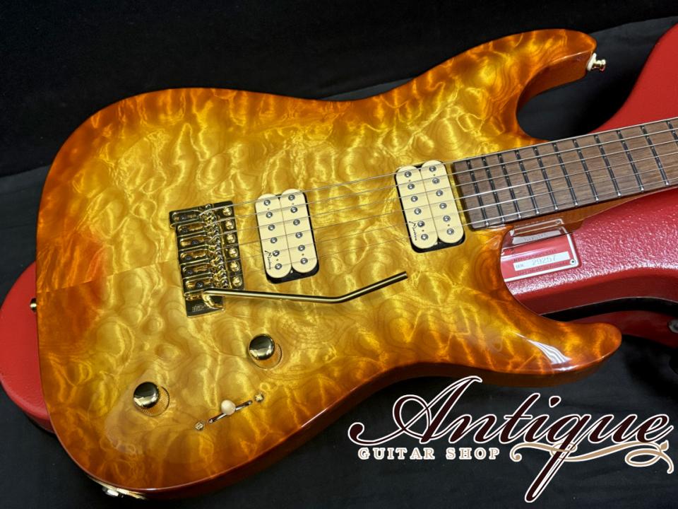 今回ご紹介させて頂くのは、創業20周年となるアニバーサリーイヤーである2010年に製作されたハイエンドスタイルのCarve Topモデル。ステファン本人が厳選した材とスペックにて製作した唯一無二のワンオフ特注品。Carve Topモデルでは通常使用されない強烈過ぎる珠玉のキルトメイプルトップ、通常オーダー不可となるハカランダ指板を始めとした最高峰のウッドマテリアル、特注製作のスペシャルワウンド・ダブルホワイトのPU搭載等、他とは完全別格スペックとなる贅沢仕様。更にはファーストオーナー様がコレクション重視にて大切にされてきた極上ニアミントコンディションの一本になります。