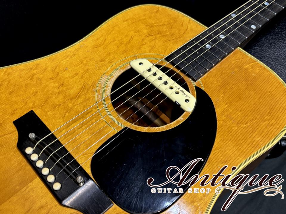 そしてその気になるサウンドですが、近年物では決して味わえない、ヴィンテージならではの極上ウッドマテリアルに半世紀以上の歳月によって熟成されたサウンドが魅力の一本。大きなボリュームながらも奥行を感じさせる味わい深いサウンドで、煌びやかなトーンと粘り強いダイナミックなサウンド特性はやはりハカランダボディとトップはアディロンかと思わせてくれます。高域は色気のある美しい旋律、中域は強く前に主張する芯のあるトーンを、低域はサウンド全体を覆いこむような甘くふくよかなアコースティックならではの広がりを感じさせます。各弦それぞれにキャラクターがシッカリしていながらも、ストロークの際に感じる気持ちの良い立体的なサウンドはこの年式、このモデルならでは。サウンドキャラクターとしては、D-28とTexanを合わせた様なニュアンスを感じさせ、フィンガーピッキングでもストロークでも楽しめる素晴らしい一本です。また現在L.R.Buggs PUが搭載されており、生音だけでなくアンプからの出力も楽しめる実戦的な仕様となっております。