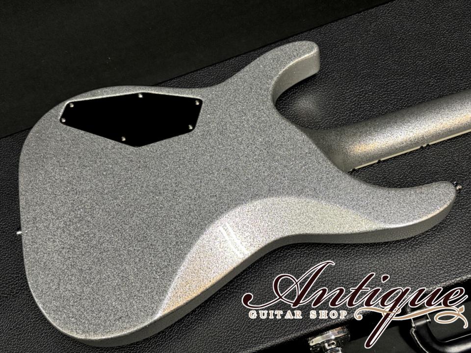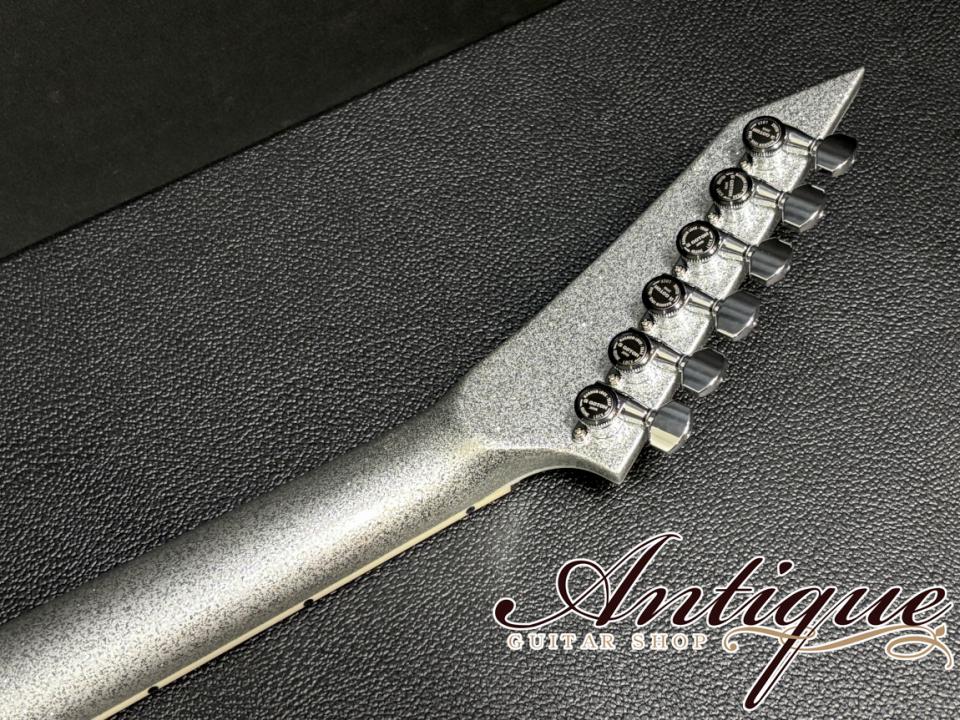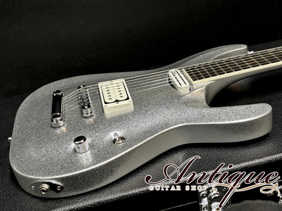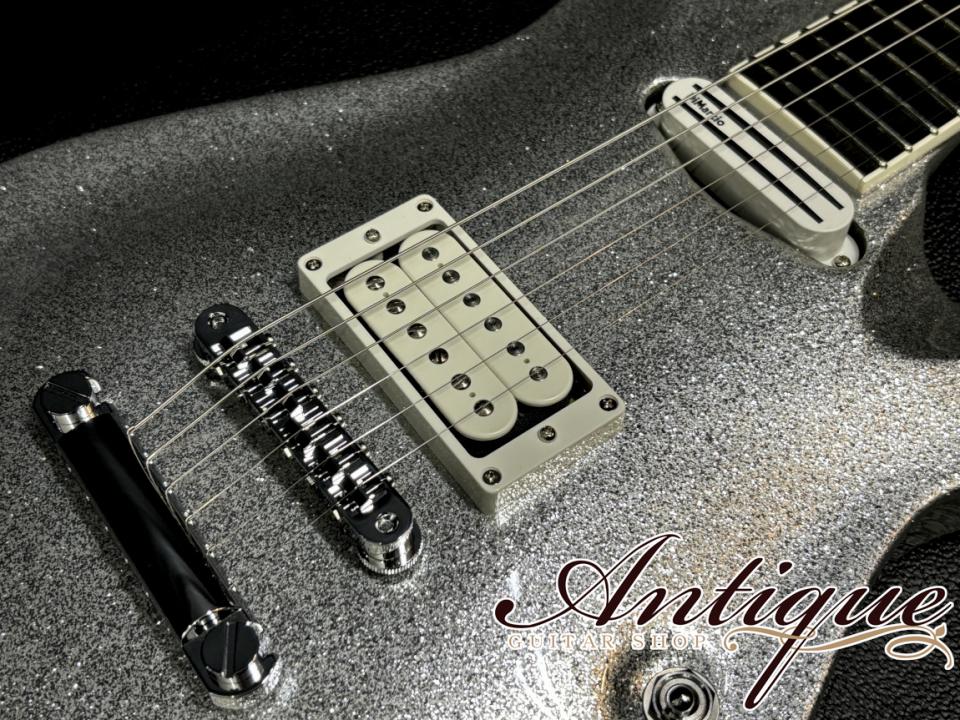 そしてその気になるサウンドですが、ピックアップには本人機同様共にDimarzioにて、フロントにはPro Track(DP188)のダイレクトマウント、リアにはTone Zone(DP155)のエスカッションマウントのHHレイアウトにて、こちらはシルバーカラー&クロームパーツにマッチするホワイトパーツを採用。フロントのPro Trackはシングルサイズとは思えない充分なパワーを持ち、傾向としてはVintage PAFを意識したトーンキャラクターにてウォームかつ温かみを持ちながら、低域でもシッカリとした音像で音の芯を崩しません。リアのTone Zoneは重圧な低音とローミッドのレスポンスが低域成分を増強し、全体として音圧感のあるサウンドをアウトプットします。コントロールは1Vol、3wayセレクターとシンプルながらに、ヴィンテージライクな味わいのあるロックから、ゴリゴリにドライブさせたハードロックトーンまで幅広くカバー。帯域バランスの良さ、コンプ感も良く、スルーネック&ノントレならではのボディとネックの一体感、レスポンスの速さを持ち、まさにプロアーティスト仕様と呼ぶに相応しい極めて高いクオリティを感じさせてくれます。