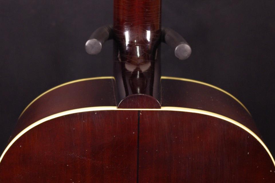1940年代のJ-45バナー期を究極に再現したJ-45 1942 Banner Murphy Labが極上コンディションで入荷しました!!トップにはサーマリーエイジド加工が施されたアディロンダックレッドスプルース、サイドバックにはマホガニーの厳選された材を採用、マーフィー・ラボによりライトエイジドされたモデルでビンテージギターを手にしたような雰囲気、サウンドが特徴!!2024年製でサイドに傷がついていますが元々エイジド加工されていますので気になりません。サウンドホールの弾き傷やウェザーチェックの入り方も驚くほどリアルな質感でルックスも存在感がありますね!ヘッド形状やバナーロゴ、ペグやピックガードなどパーツもオリジナルで見事に再現されています!ネックヒールへのストラップピン加工、ピックアップの取り付け加工はございません。ナット幅は約44mm、やや太めの40年代らしいグリップです!ネックのアングルも理想的でトラスロッドの動作も問題なく機能します。フレットの減りも無く長期で安心いただけます。弦高は12フレット6弦側で約2.6mm、1弦側で約1.6mmの高さでハイポジションまで押さえやすいです。お好みに合せた微調整にもお応えいたします。アディロンダックスプルースにふさわしいヴォリューム感、ハリがありますね!サーマリーエイジド加工の影響も大きく素晴らしく乾いた粒立ち良いビンテージのサウンドでお楽しみいただけます!!一押し!!オリジナルハードケース付き!